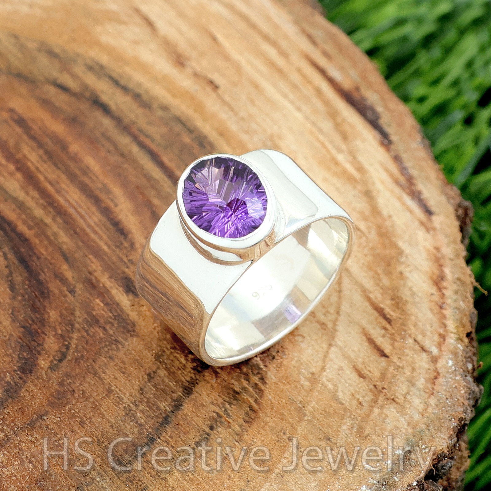 Natural Amethyst Fancy Cut 925 Sterling Silver Handmade Wide Band Ring for Women