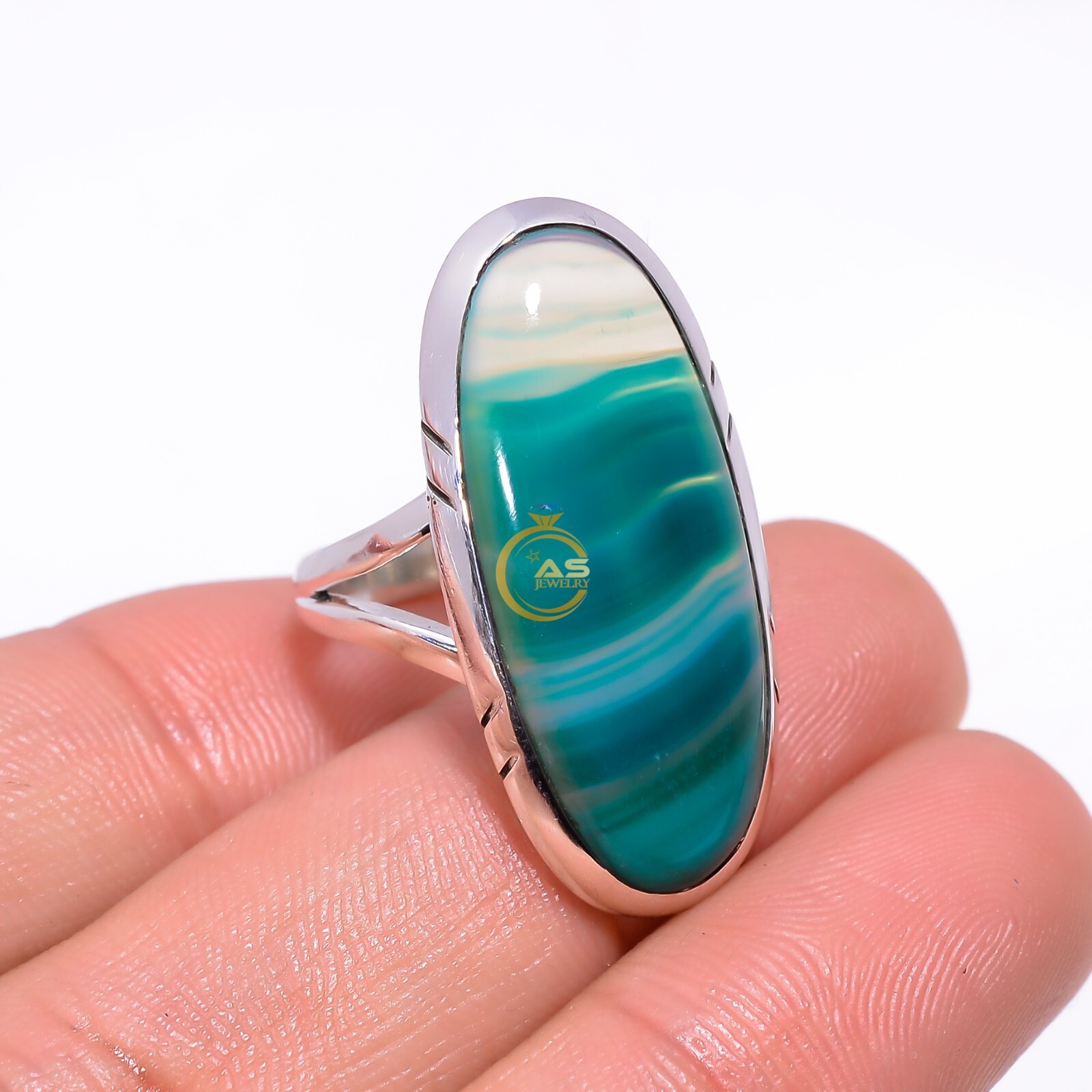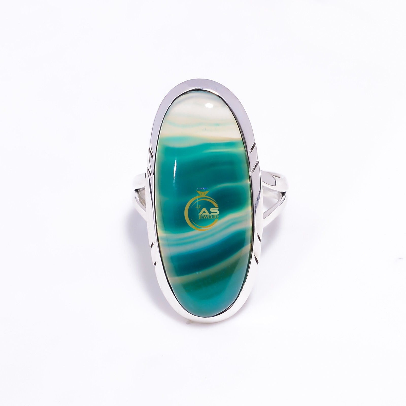 Green Banded Agate Ring 925 Sterling Silver Handmade Statement Ring Gift Jewelry