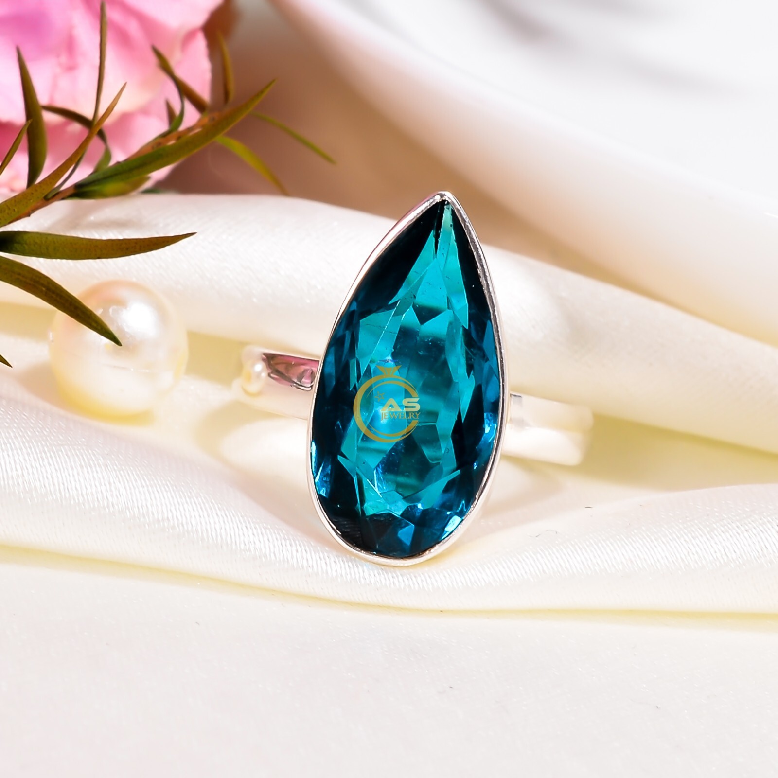как выглядит Blue Topaz Glass Stone Ring 925 Sterling Silver Boho Rings Gift Jewelry for Her фото