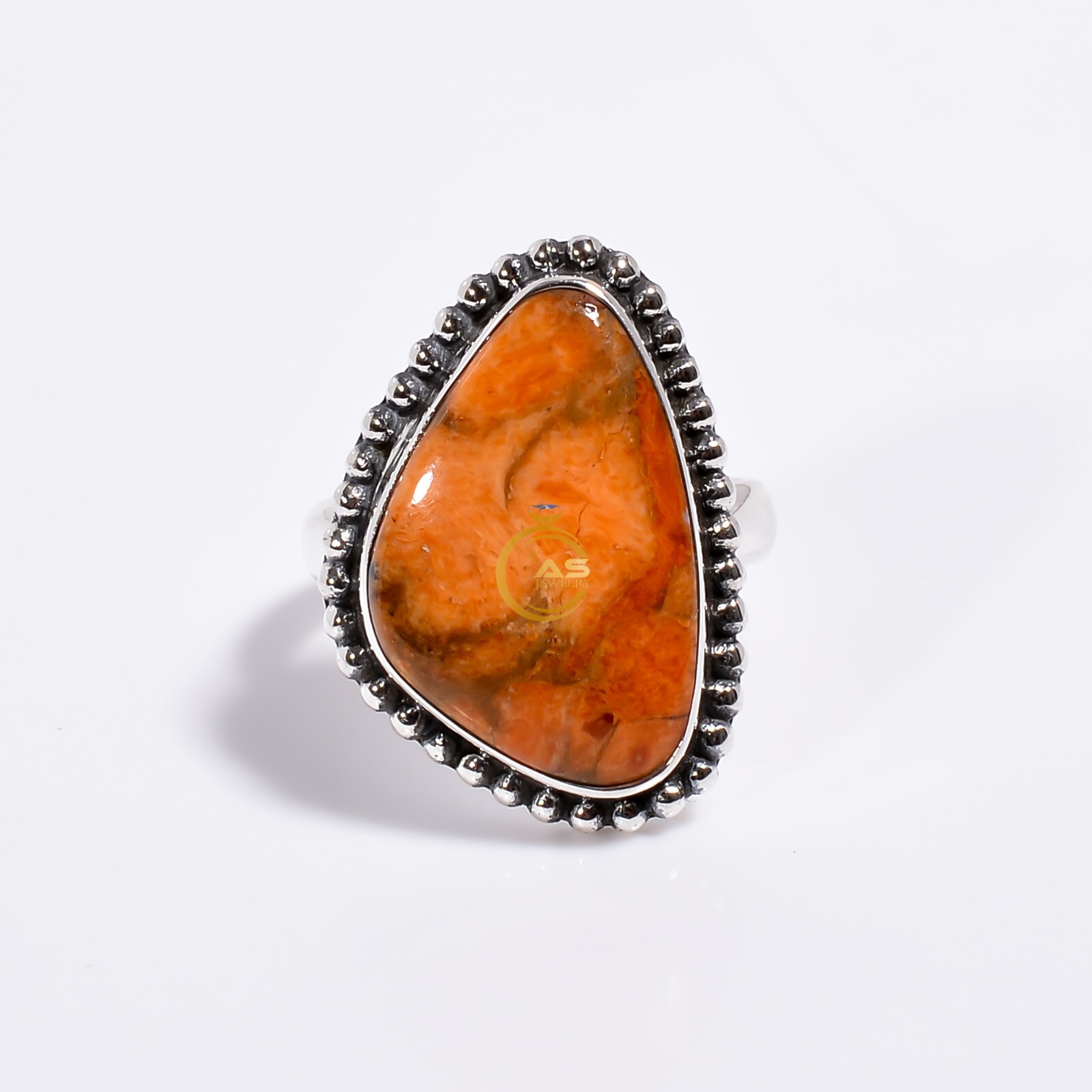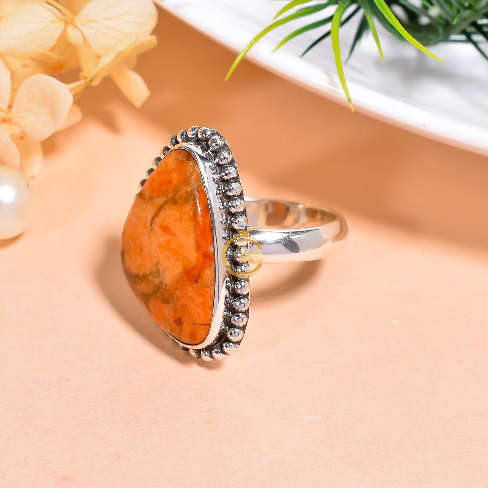 Sponge Coral Gemstone Ring Orange Stone 925 Sterling Silver Statement Rings