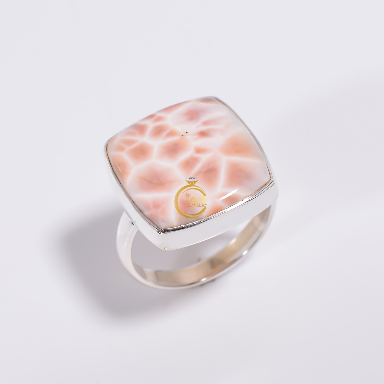 Natural Pink Larimar Ring Pink Stone 925 Sterling Silver Boho Rings for Women
