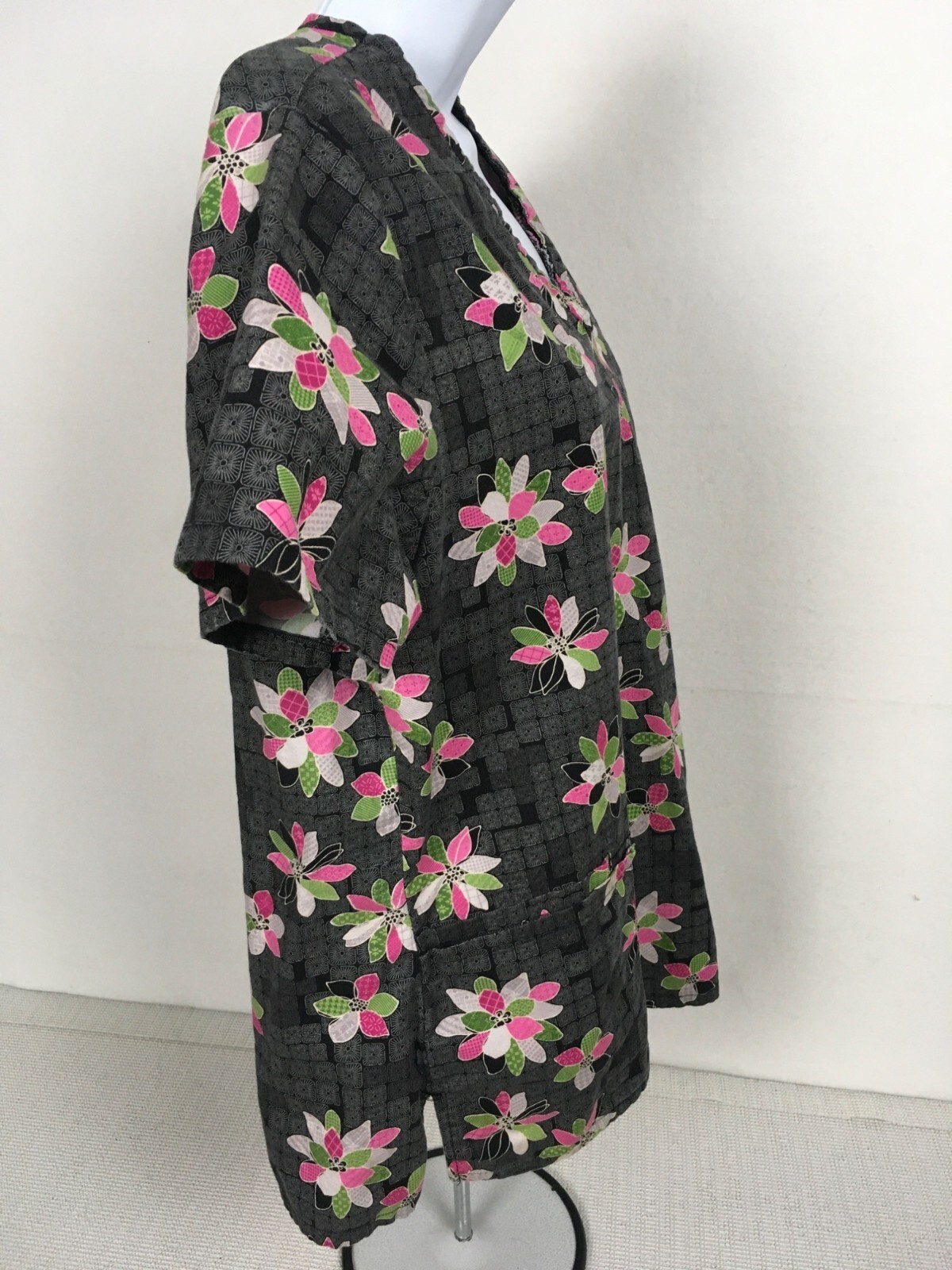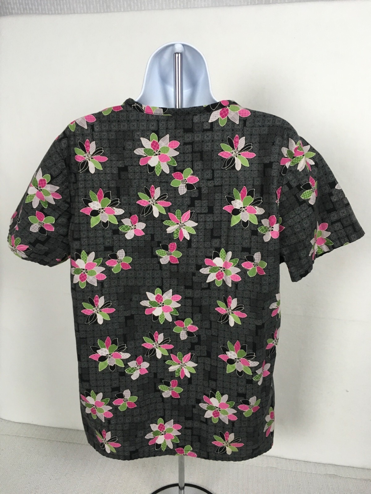 SB Scrubs Womens Scrub Top Size M Gray w Colorful Flowers Short Sleeves Pockets