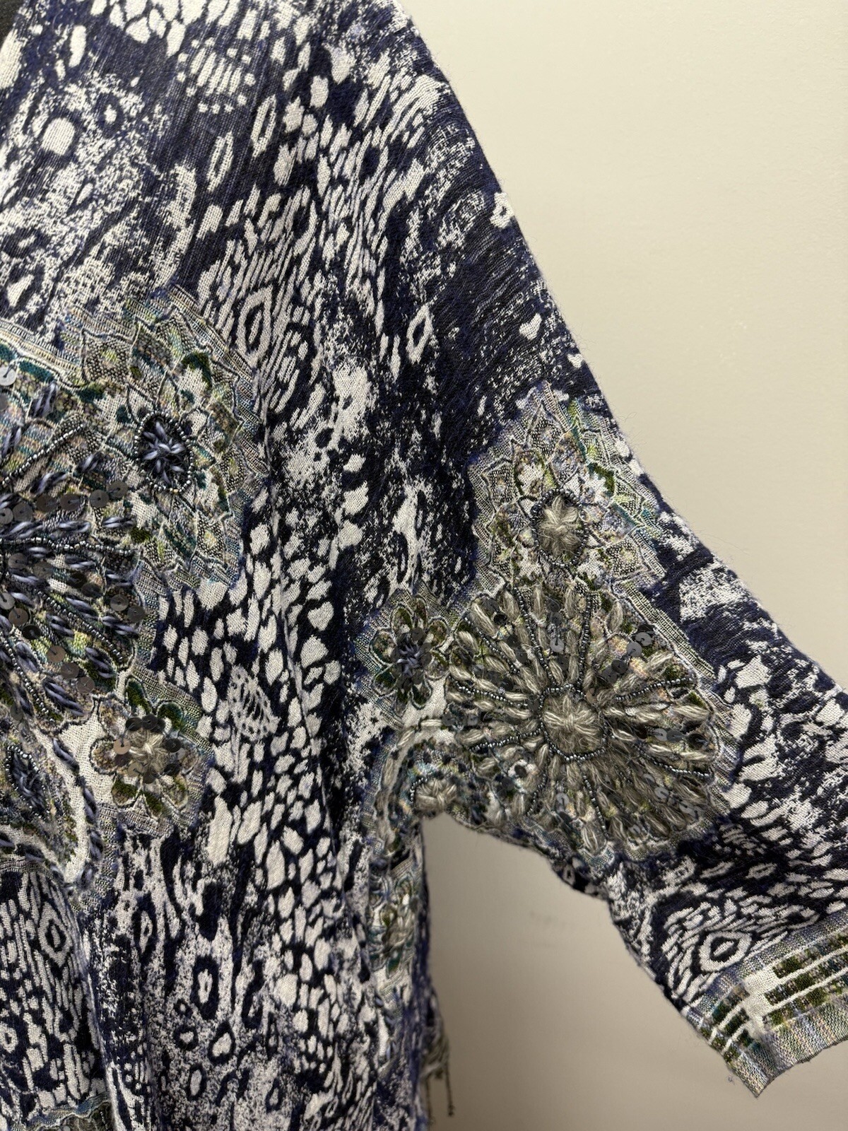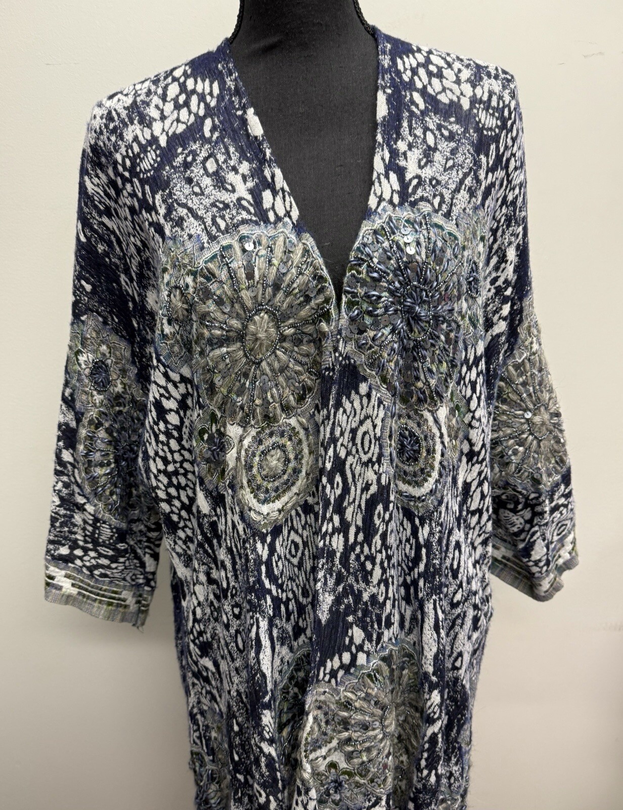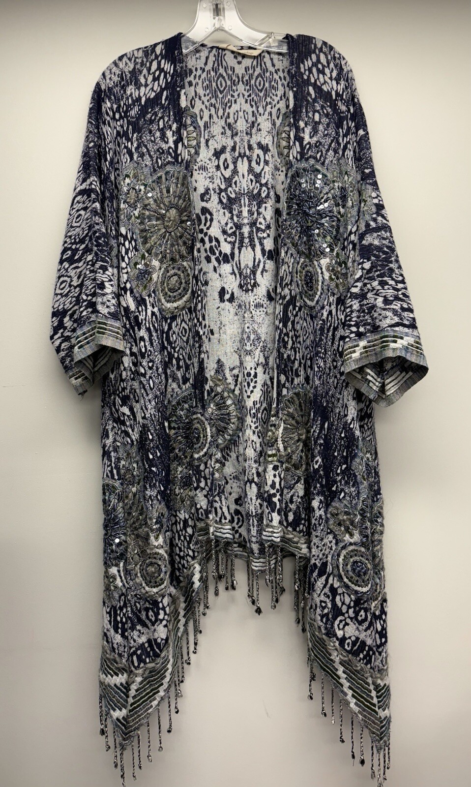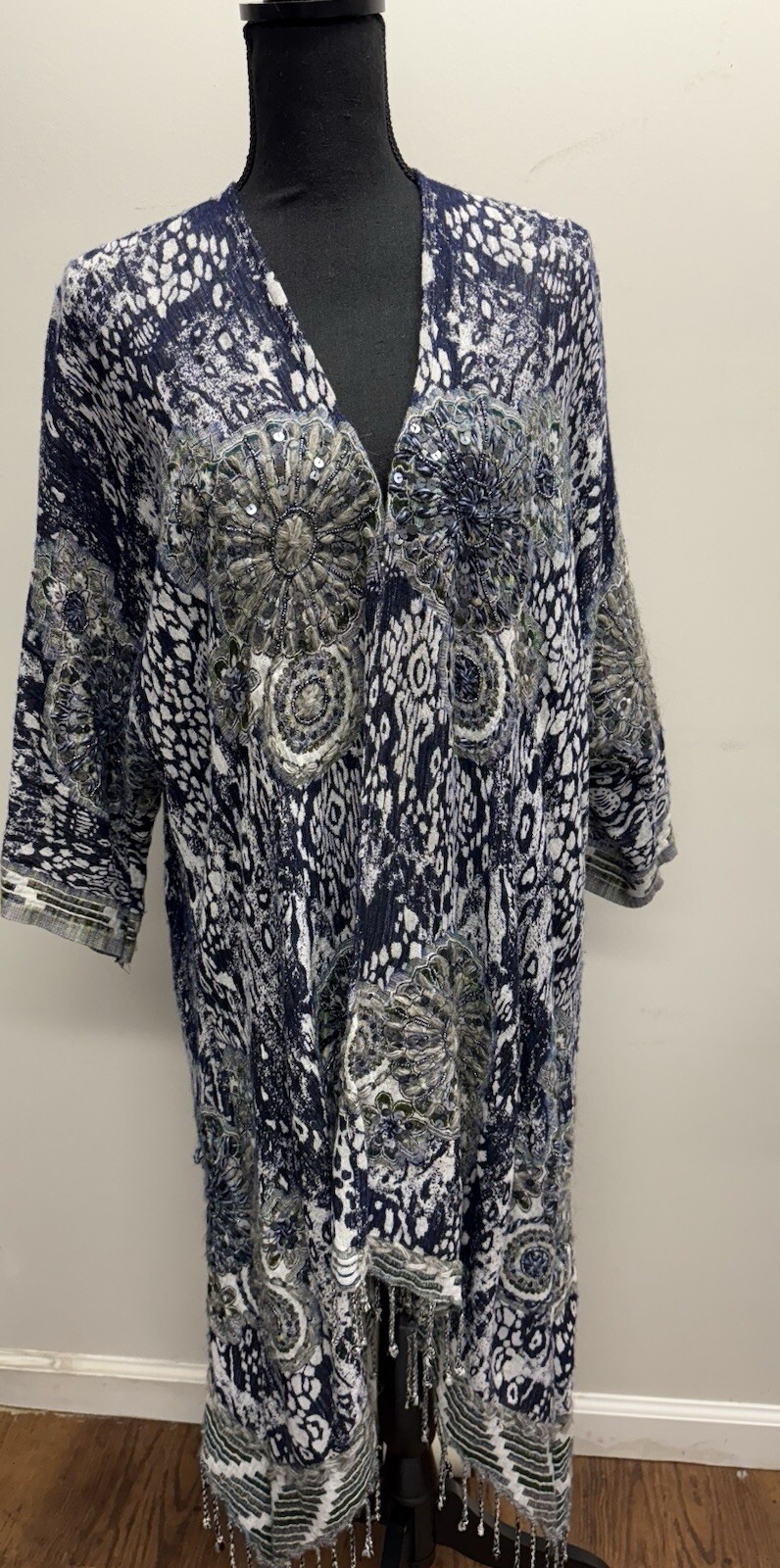 Soft Surroundings Blue Emory Open Cardigan Embellished Fringe Wool Blend S/M