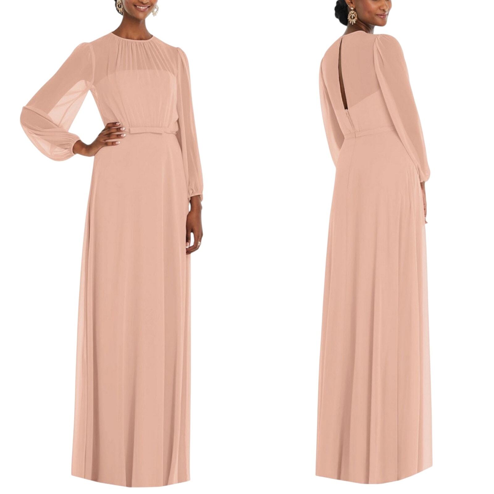 как выглядит Dessy Collection Puff Sleeve Blouson Overlay Chiffon Maxi Dress in Blush size 14 фото