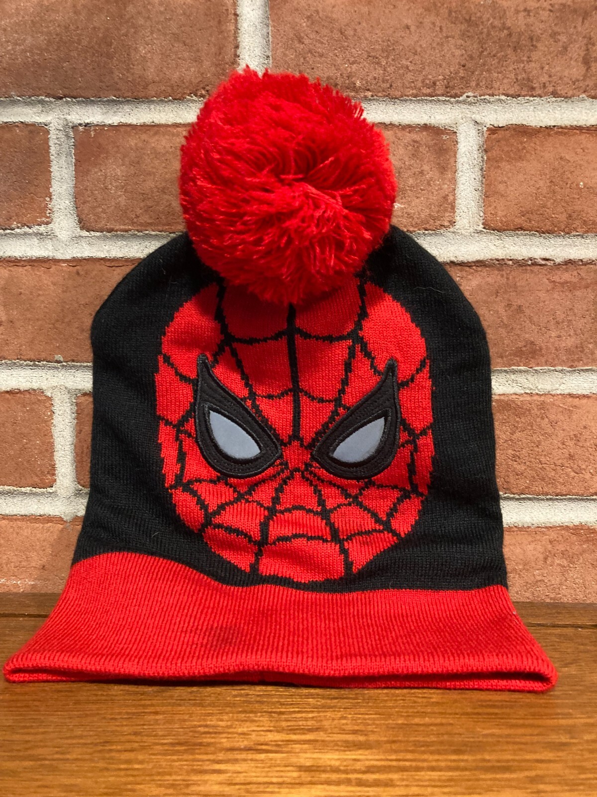 как выглядит Marvel Spiderman Mask Knitted Beanie Hat Embroidered Reflective Eyes PomPom top фото