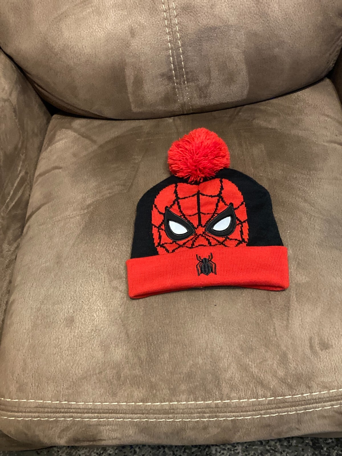 Marvel Spiderman Mask Knitted Beanie Hat Embroidered Reflective Eyes PomPom top
