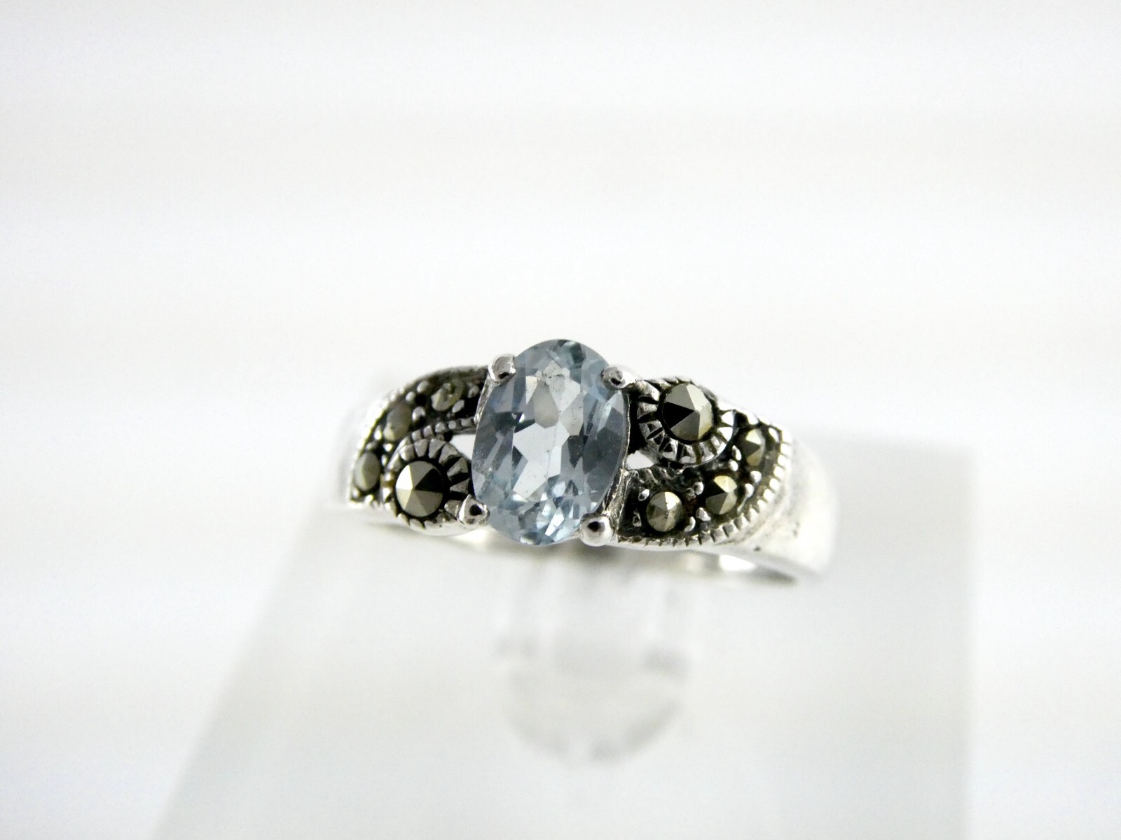 Sterling Silver Blue Topaz and Marcasite Ring 925 Size 7.25 Weighs 3.5g