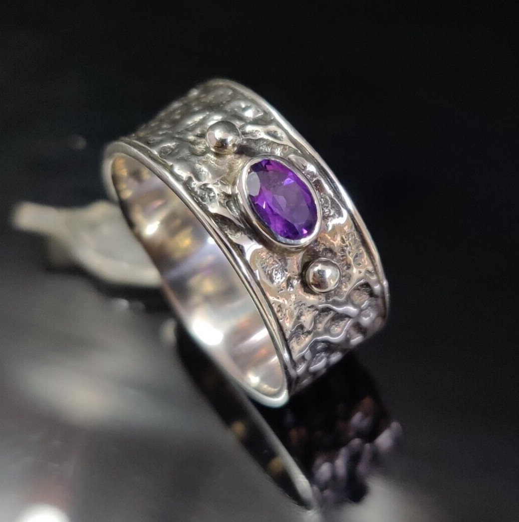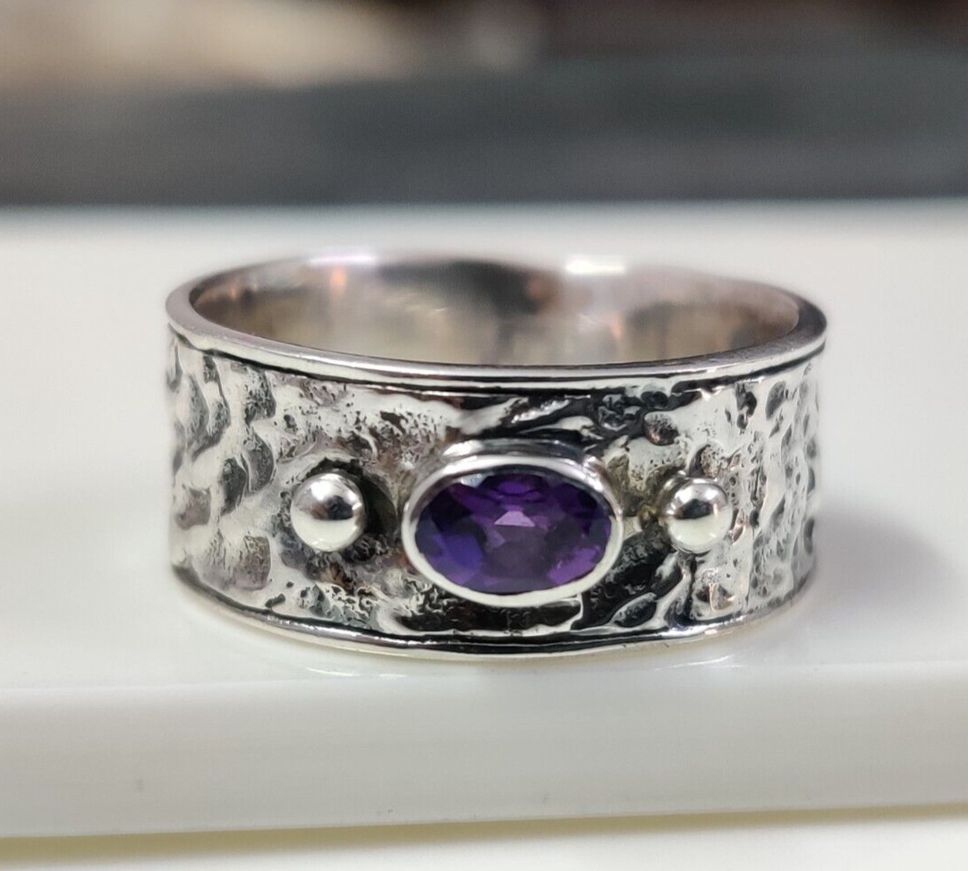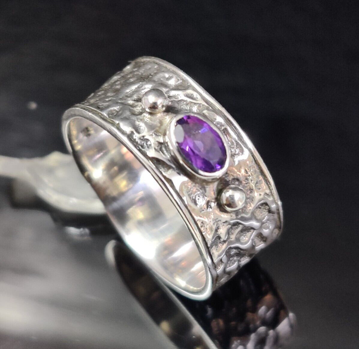 Natural Purple Amethyst Gemstone Ring Oxidised 925 Sterling Silver Hammered Ring