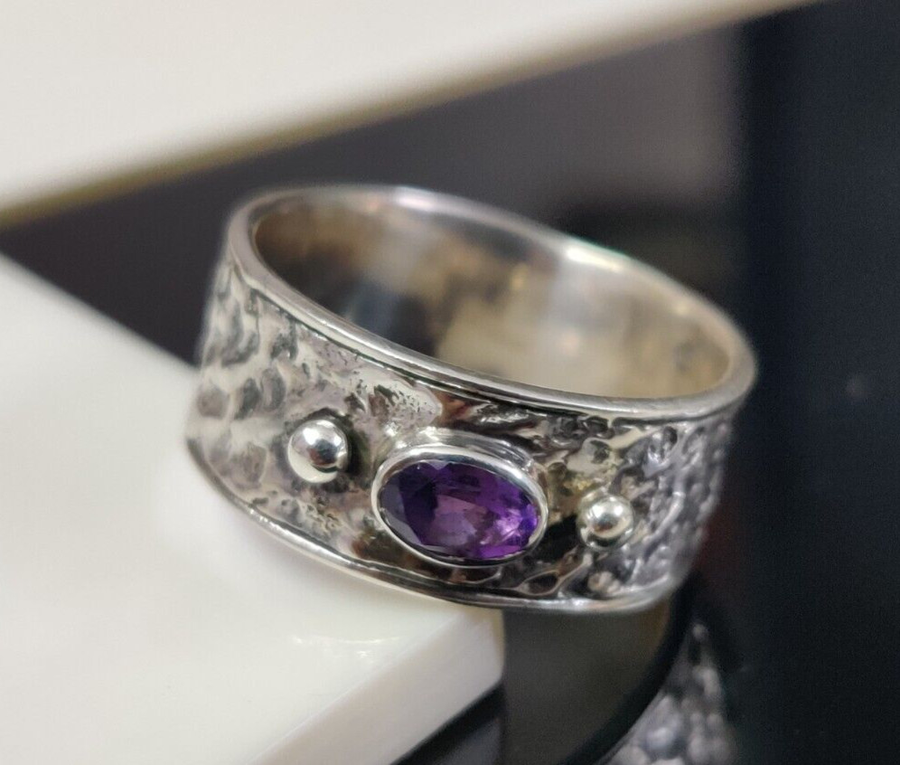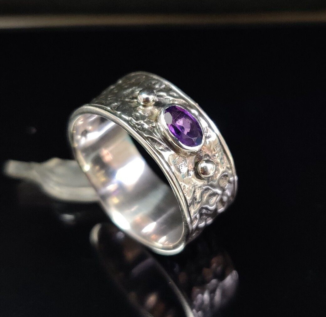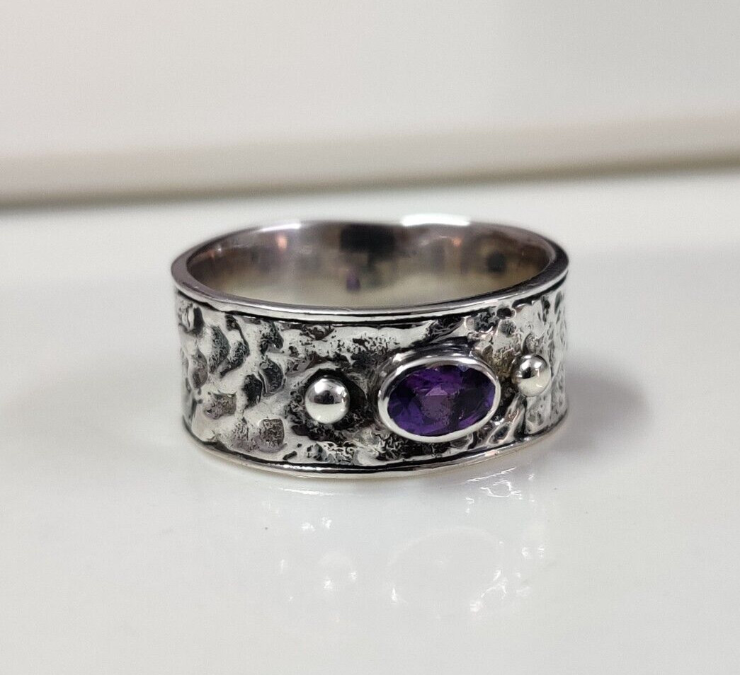 Natural Purple Amethyst Gemstone Ring Oxidised 925 Sterling Silver Hammered Ring