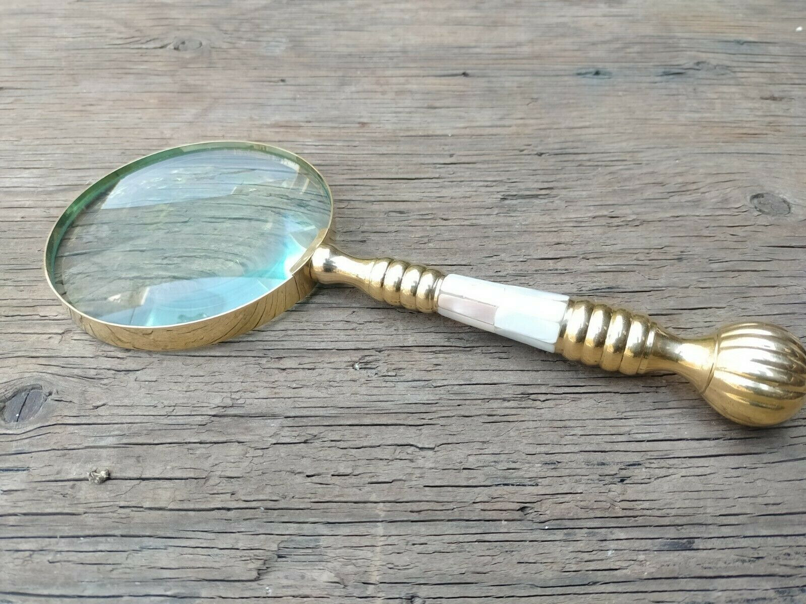 • Brass Mother of Pearl Magnifying Glass Map Reading Magnifier Table Top Item