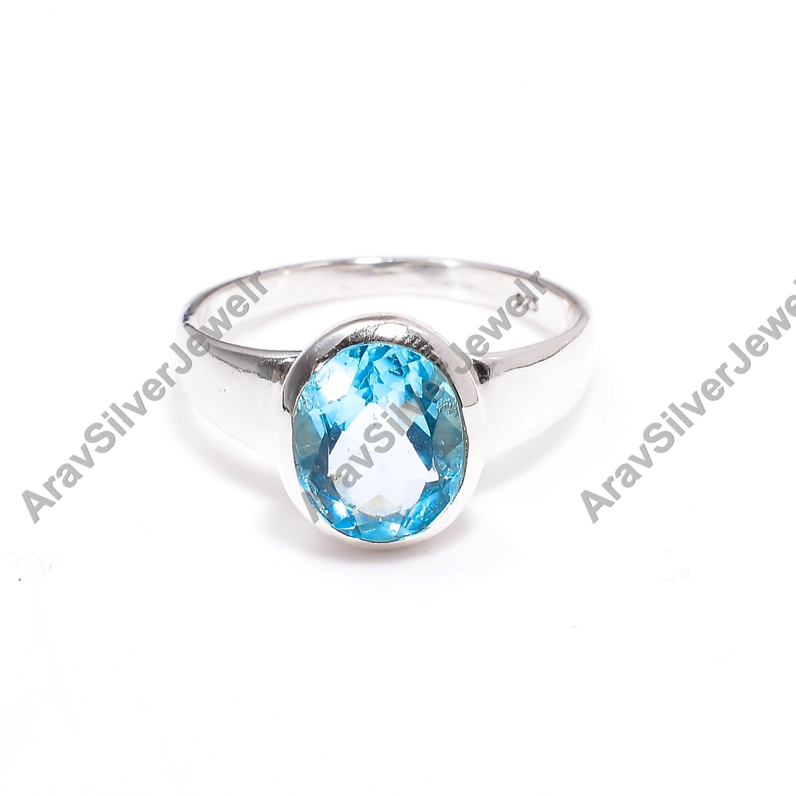Blue Topaz Cut Stone Ring 925 Sterling Silver Boho Rings Jewelry Gift for Her