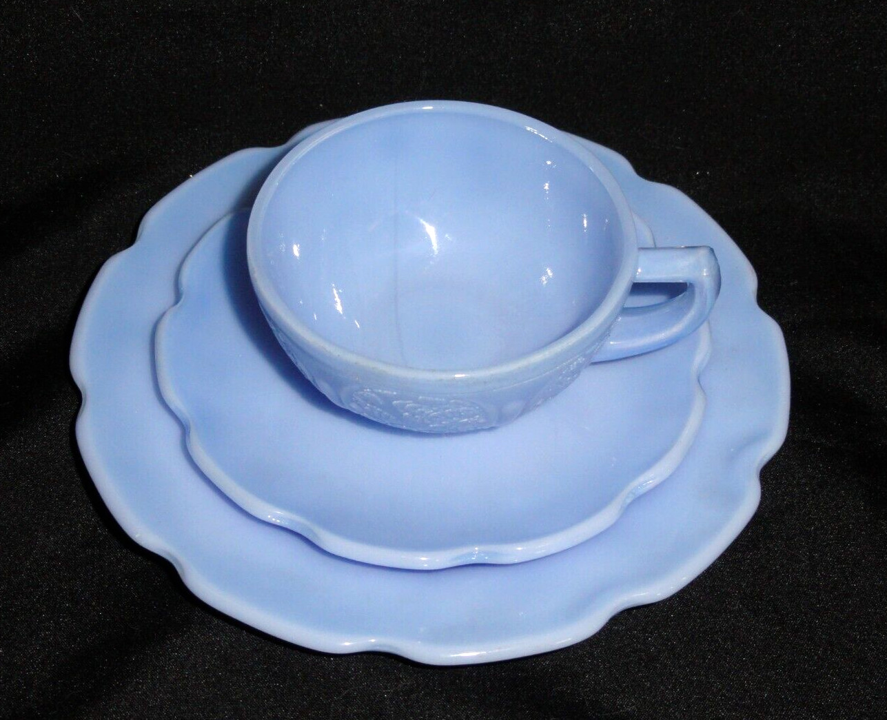 как выглядит Vintage Blue Delphite Cherry Blossom Childs 3 pc Tea Set Jeanette Glass фото