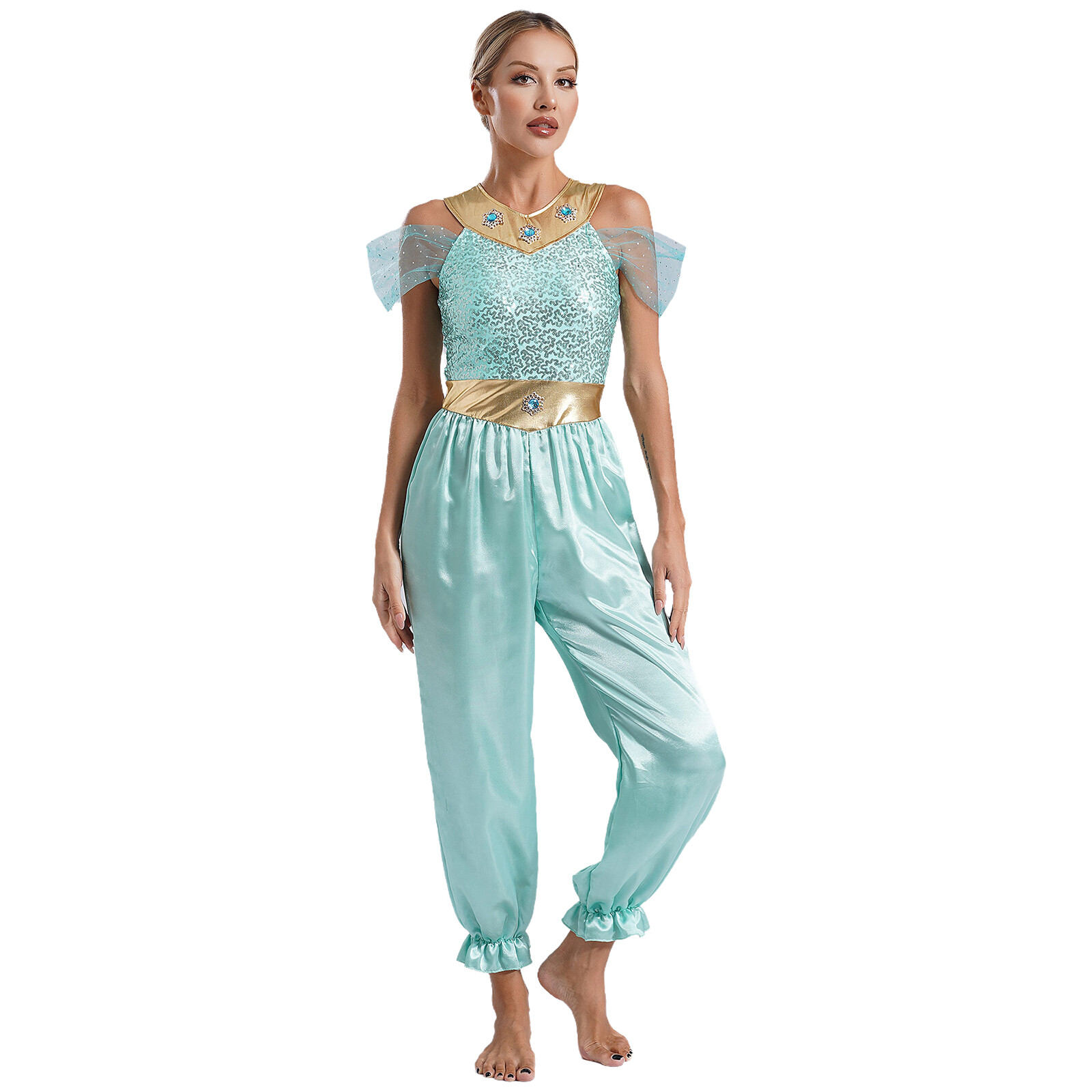 Women Arabian Belly Dance Princess Costume Sequin Romper Jumpsuit with Choker
