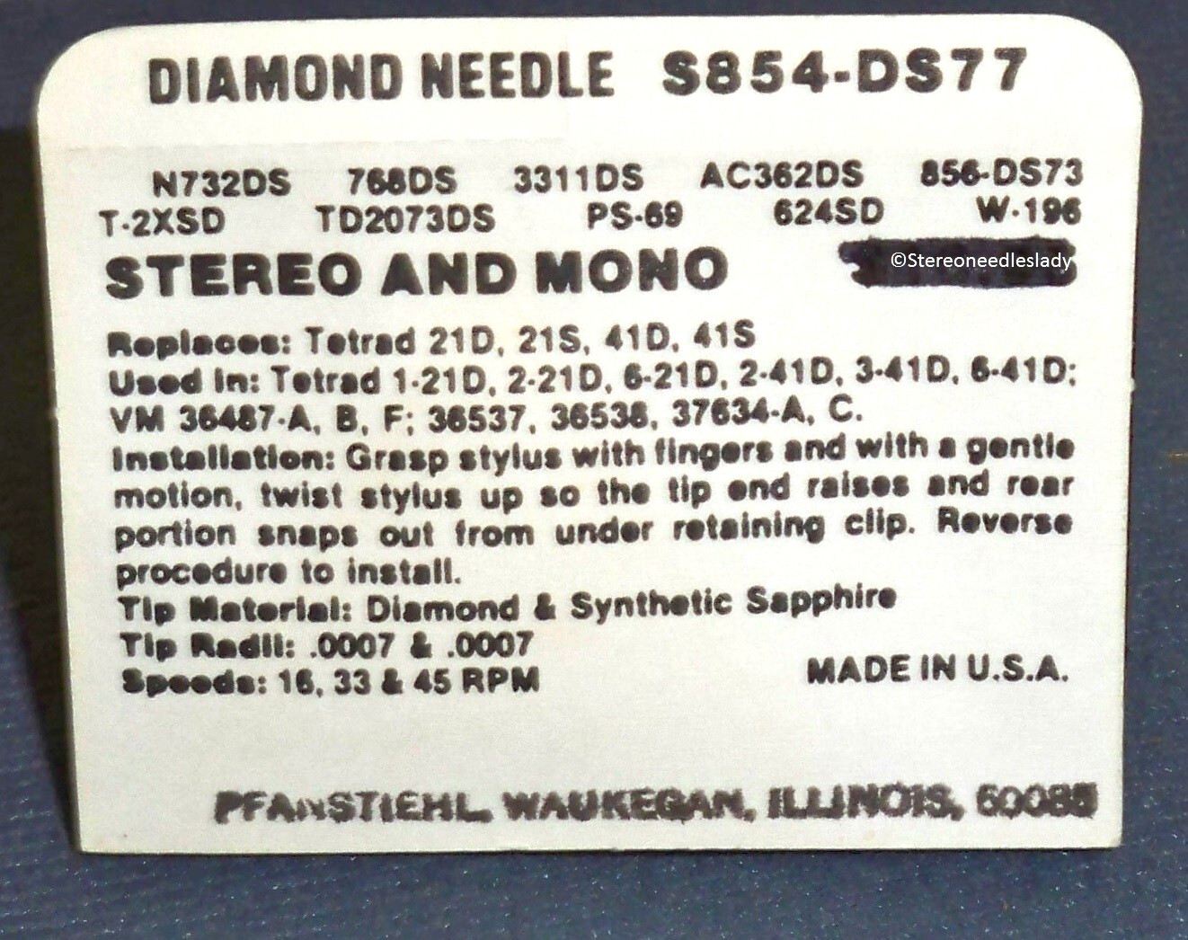 Phonograph NEEDLE STYLUS for Tetrad S853-DS77 S854-DS77 Pfanstiehl M854-DS77
