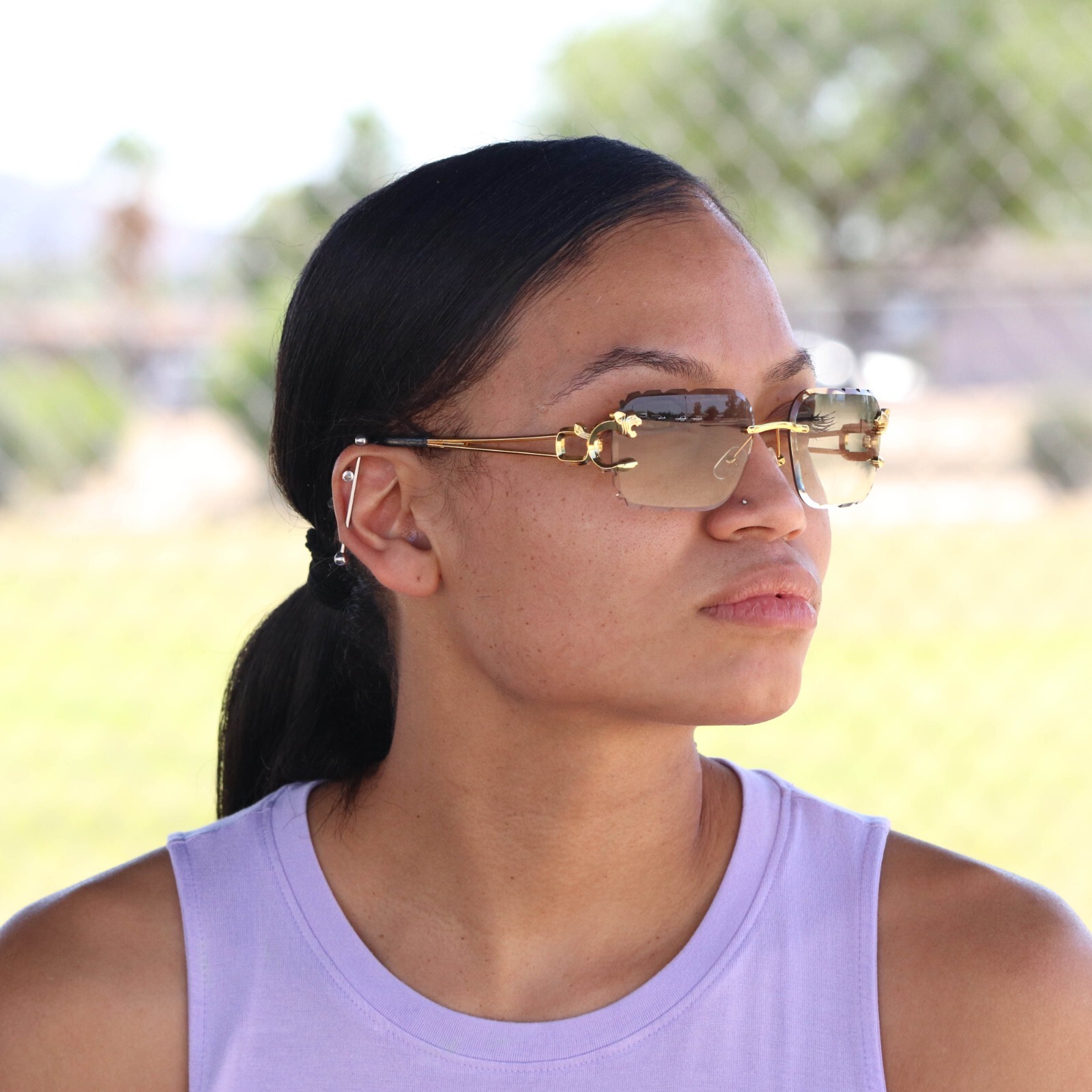 Men Classy Rimless Hip Hop Sunglasses stylish Sun Glasses Gold Rim Green Lens