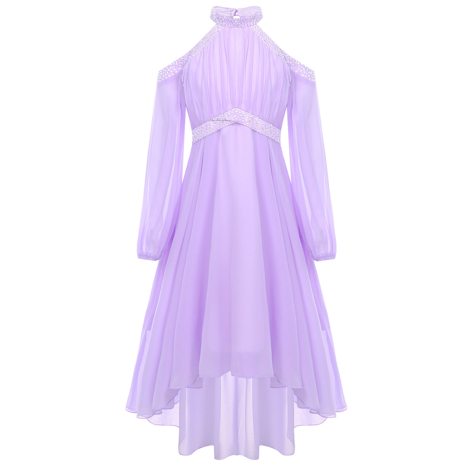 Girls Outfits Recitals Dress Solid Color Costume Birthday Long Sleeve Halter