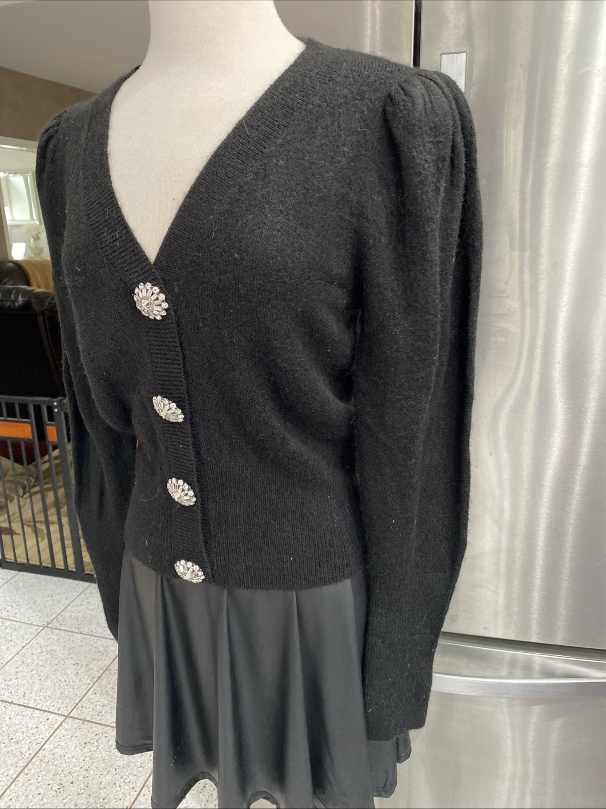 как выглядит NEW EXPRESS BLACK JEWEL RHINESTONE CRYSTAL BUTTON PUFF LONG SLEEVE SWEATER SZ XS фото