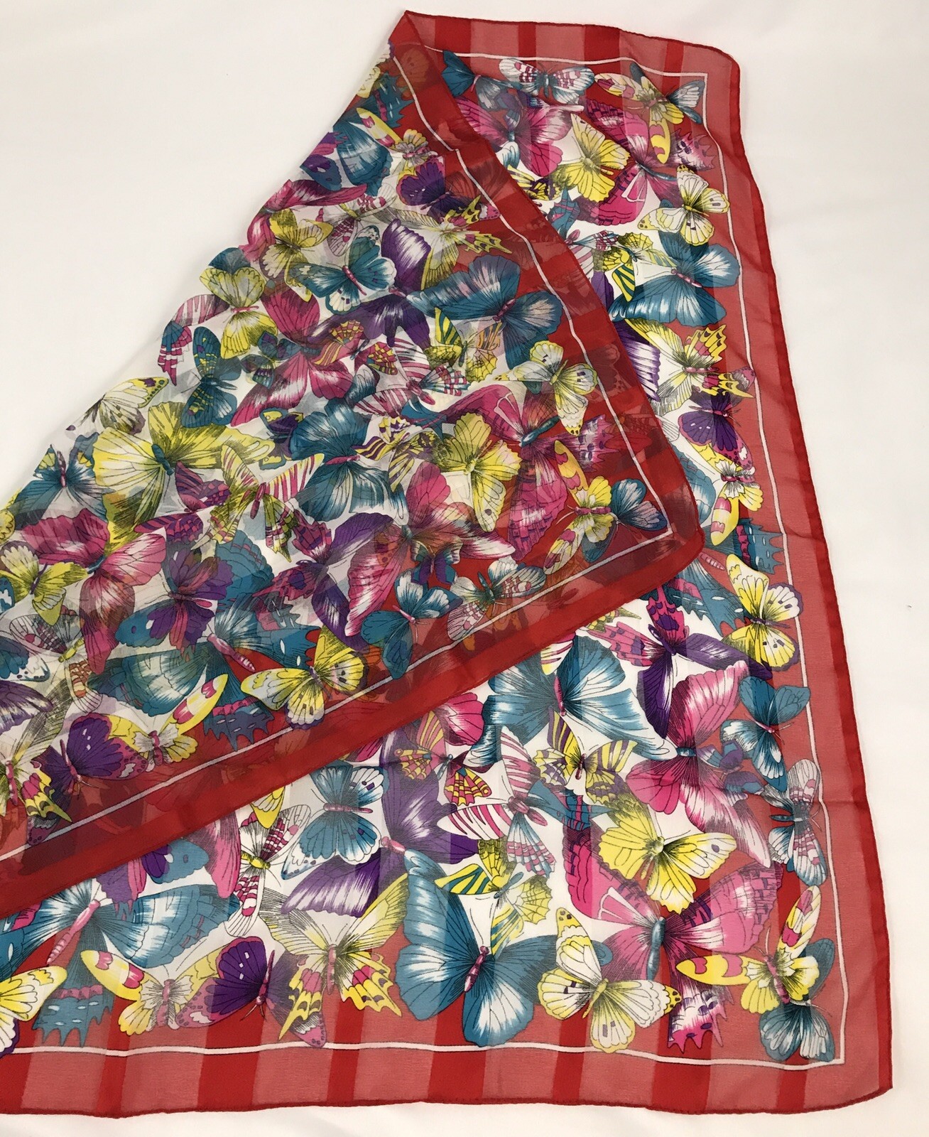 Large Square Butterfly Print Scarf Warp Floral Red Sheer Stripe Spring 90's