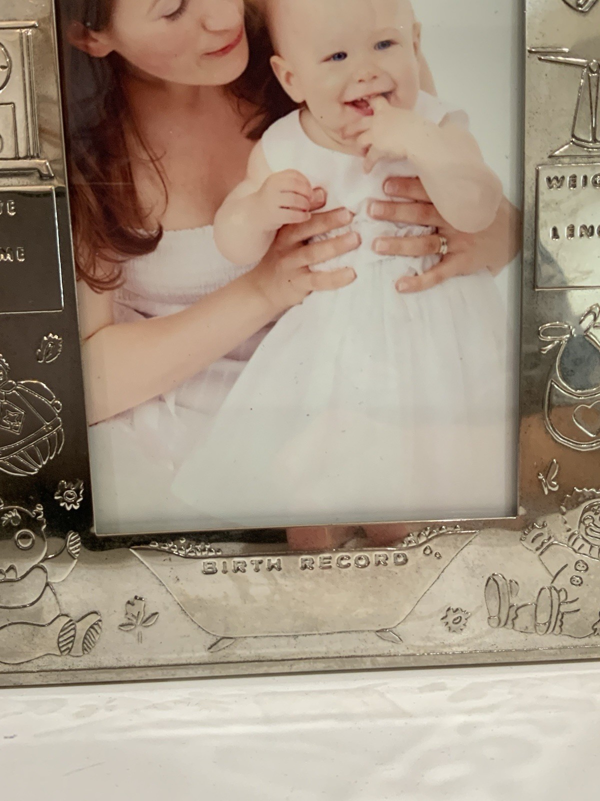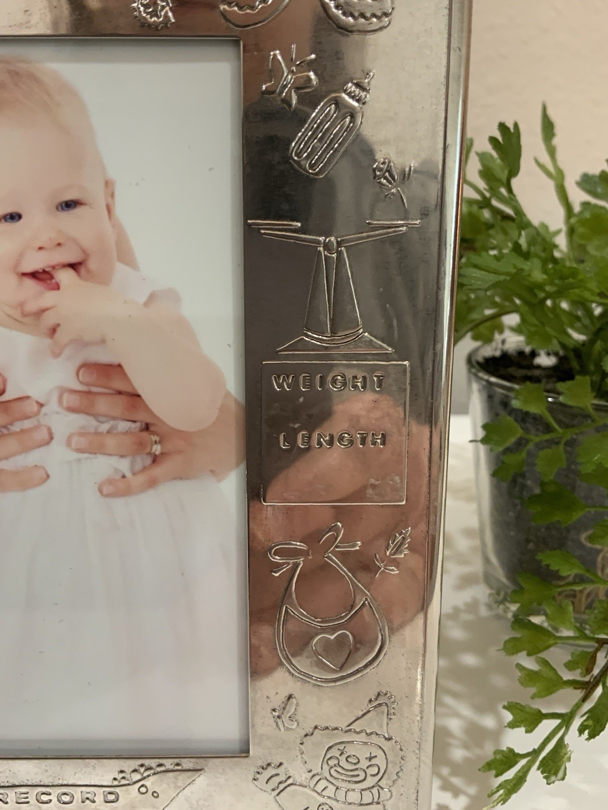 как выглядит Vtg Silver Plate Engravable Date Wt Length Baby Photo Picture Frame 3.5 X 5 фото
