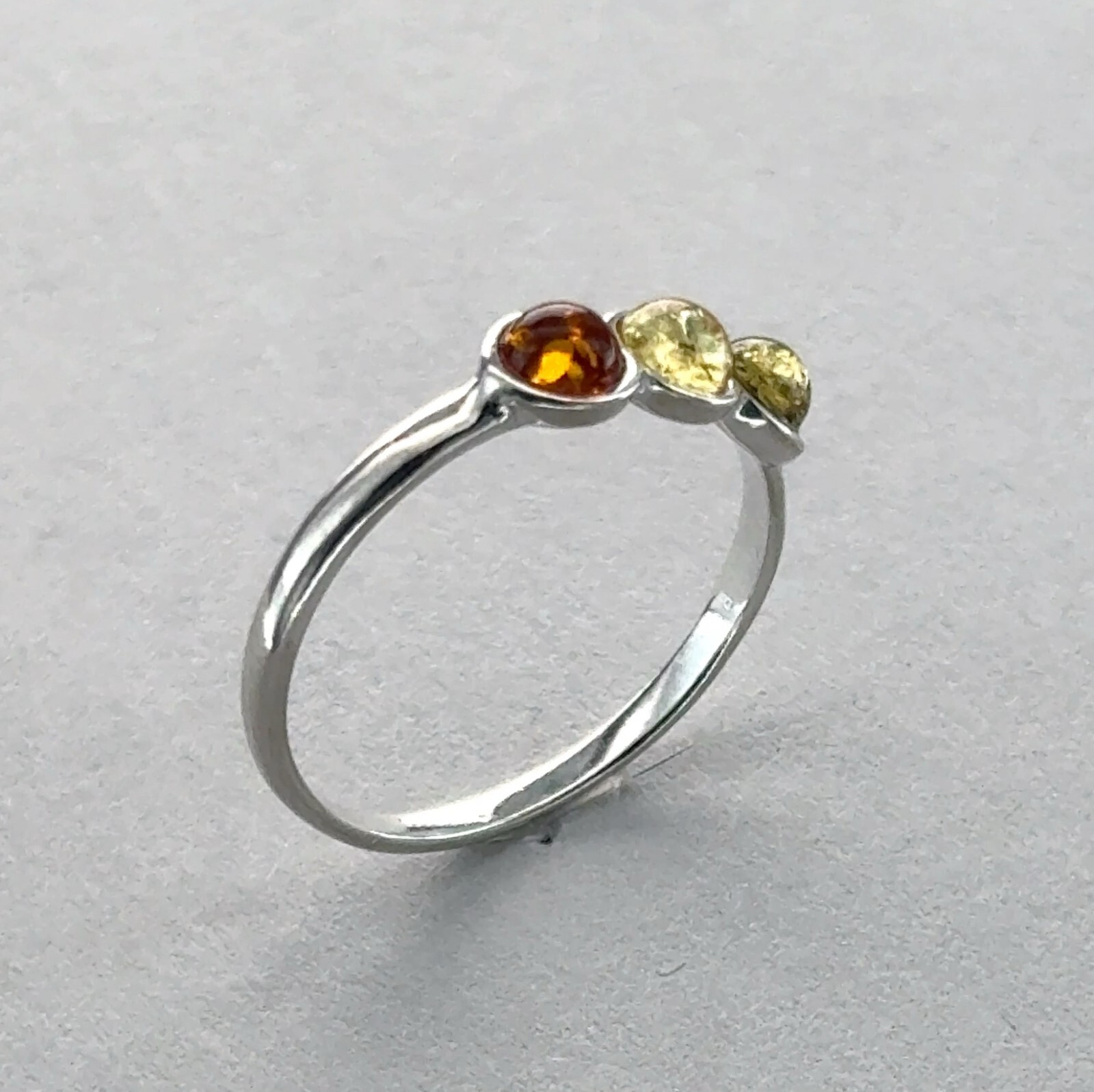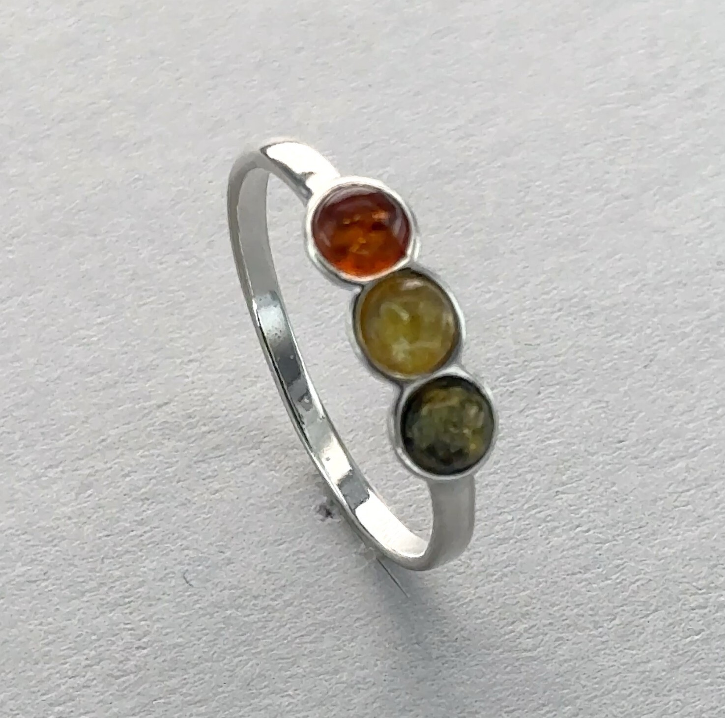 Triple Round Multi-Color BALTIC AMBER Ring - 925 STERLING SILVER Poland 50e