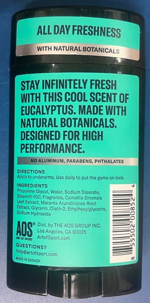 AOS Art Sport Deodorant Aluminum Free Cool Eucalyptus Scent 2.7 Oz SEE DESC