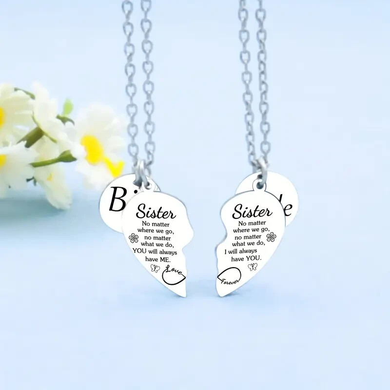 925 Sterling Silver Charm New Fashion Love Heart Big Little Sister Necklace 2pcs