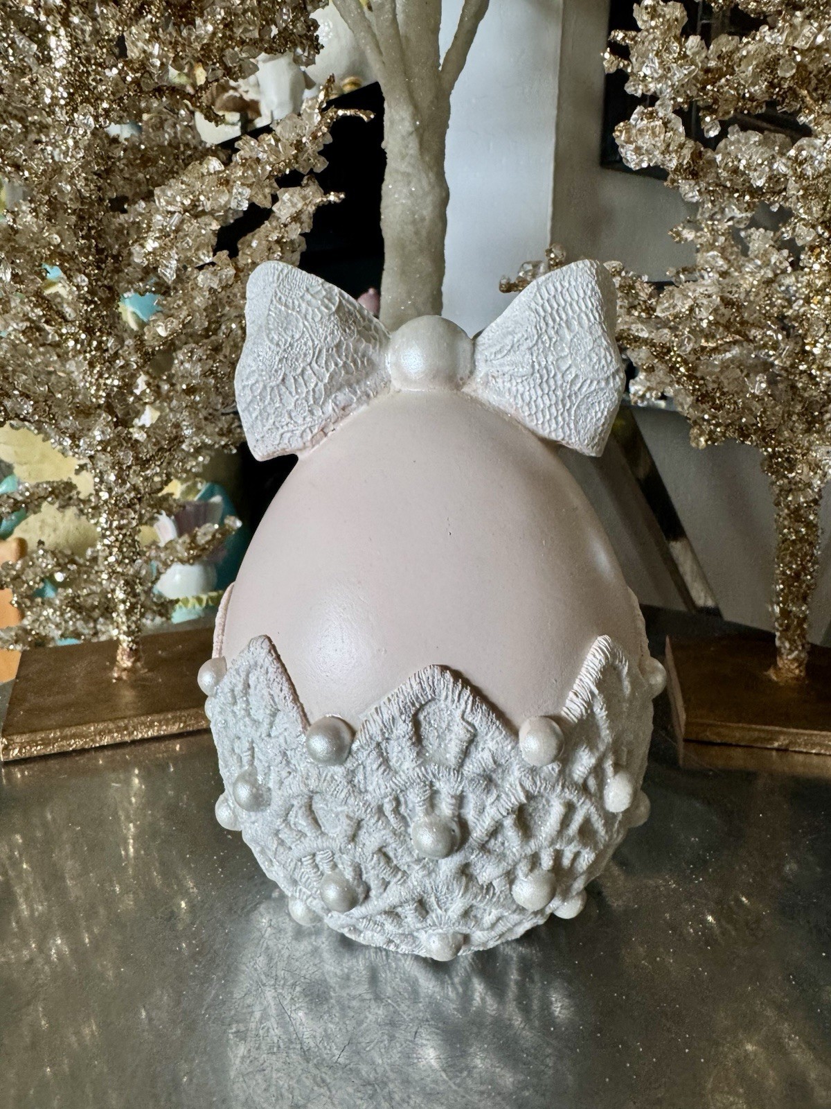 как выглядит Laura Ashley New Pink Glitter Egg With White Lace Bow Pearls фото