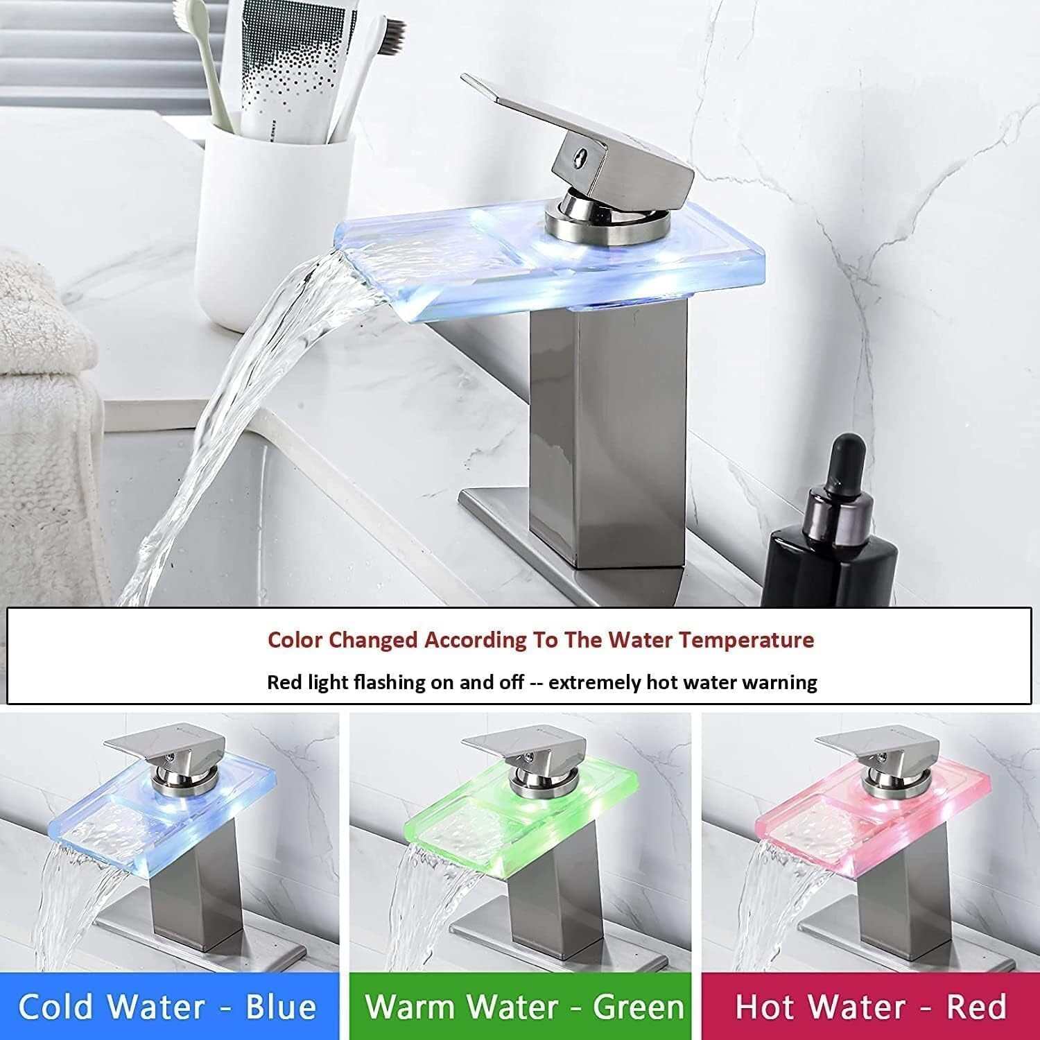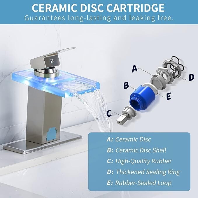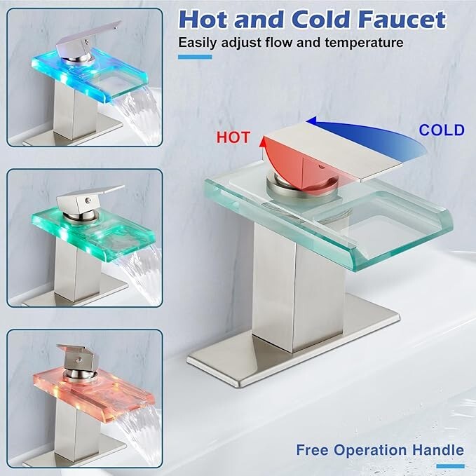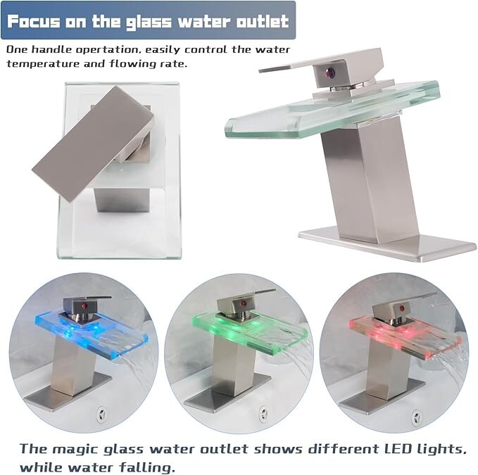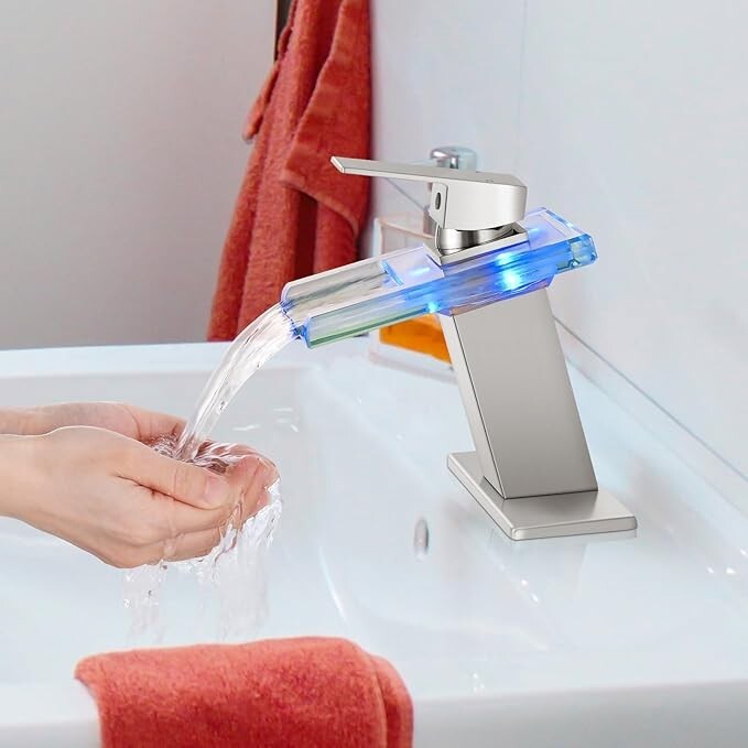 Brushed LED Waterfall Bathroom Sink Faucet Single Handle Glass Spout Mixer Tap