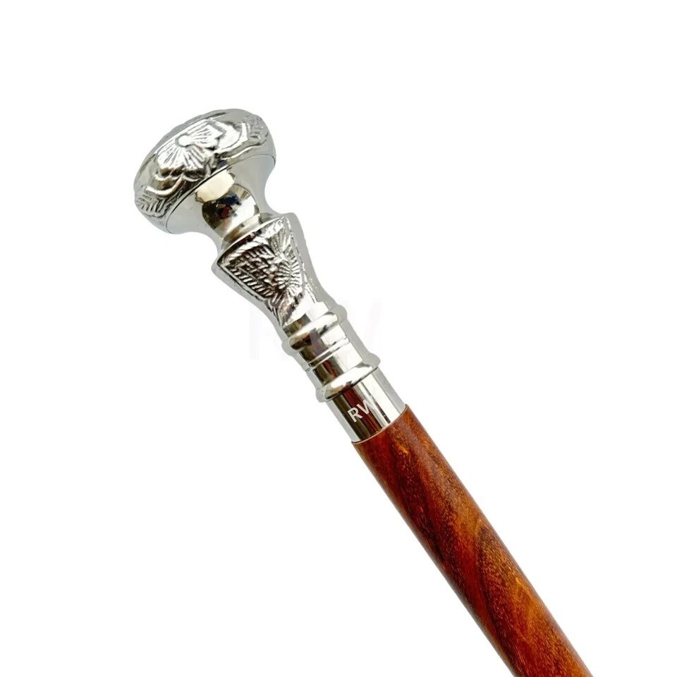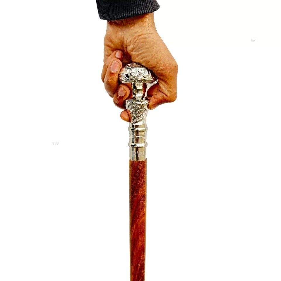 Antique Designer Brass Sliver Finish Handle Victorian Wooden Walking Stick Cane