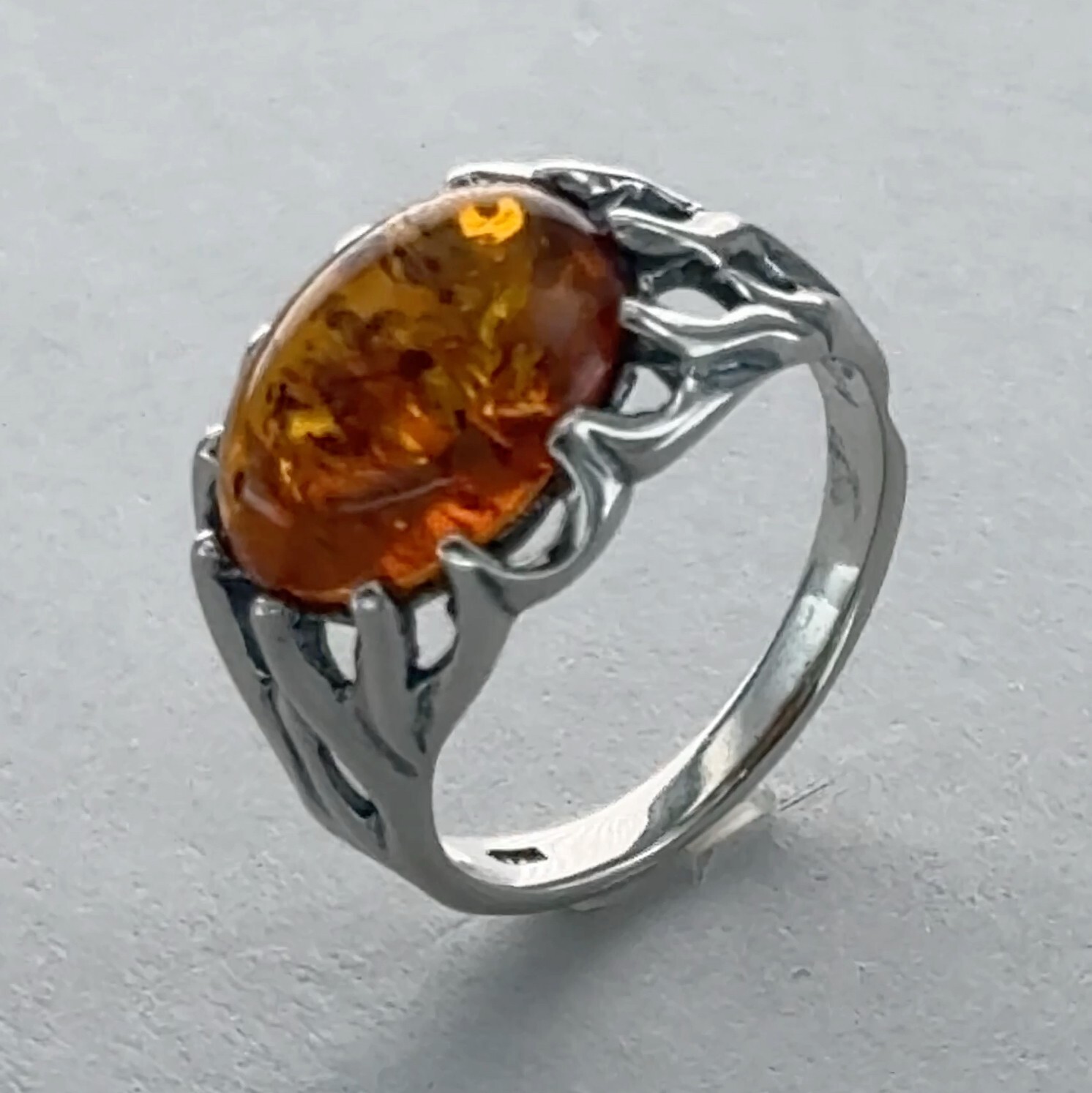 Oval Cognac / Brown BALTIC AMBER Ring - 925 STERLING SILVER - Poland 67e
