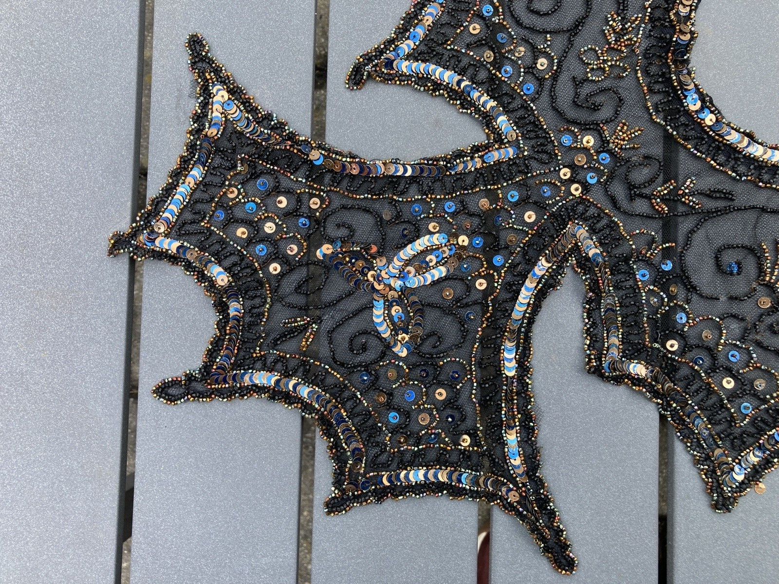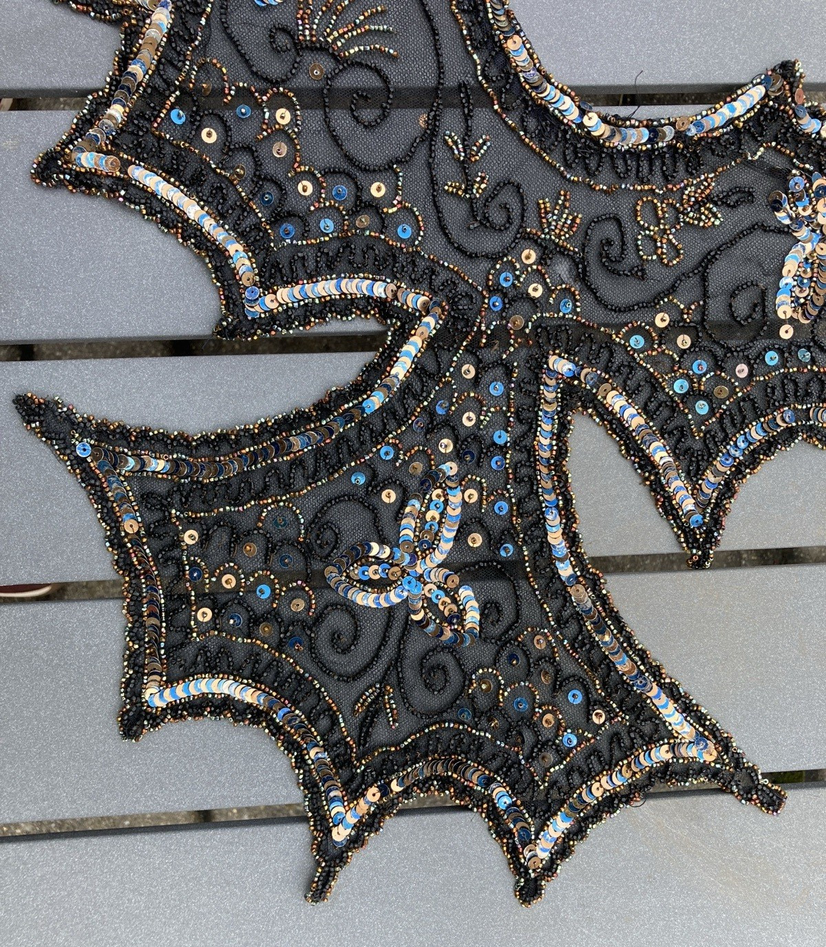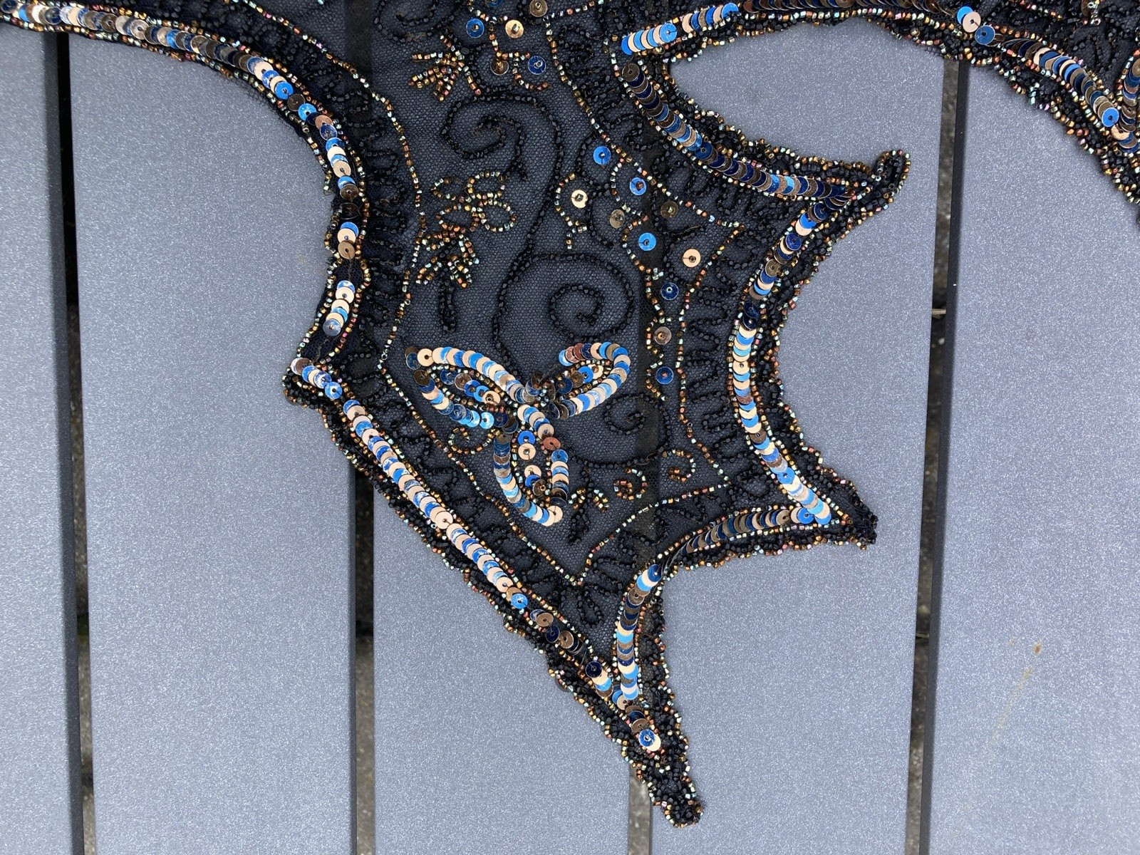 Vintage beaded mesh collar gothic bat shaped sequined gold blue black costume