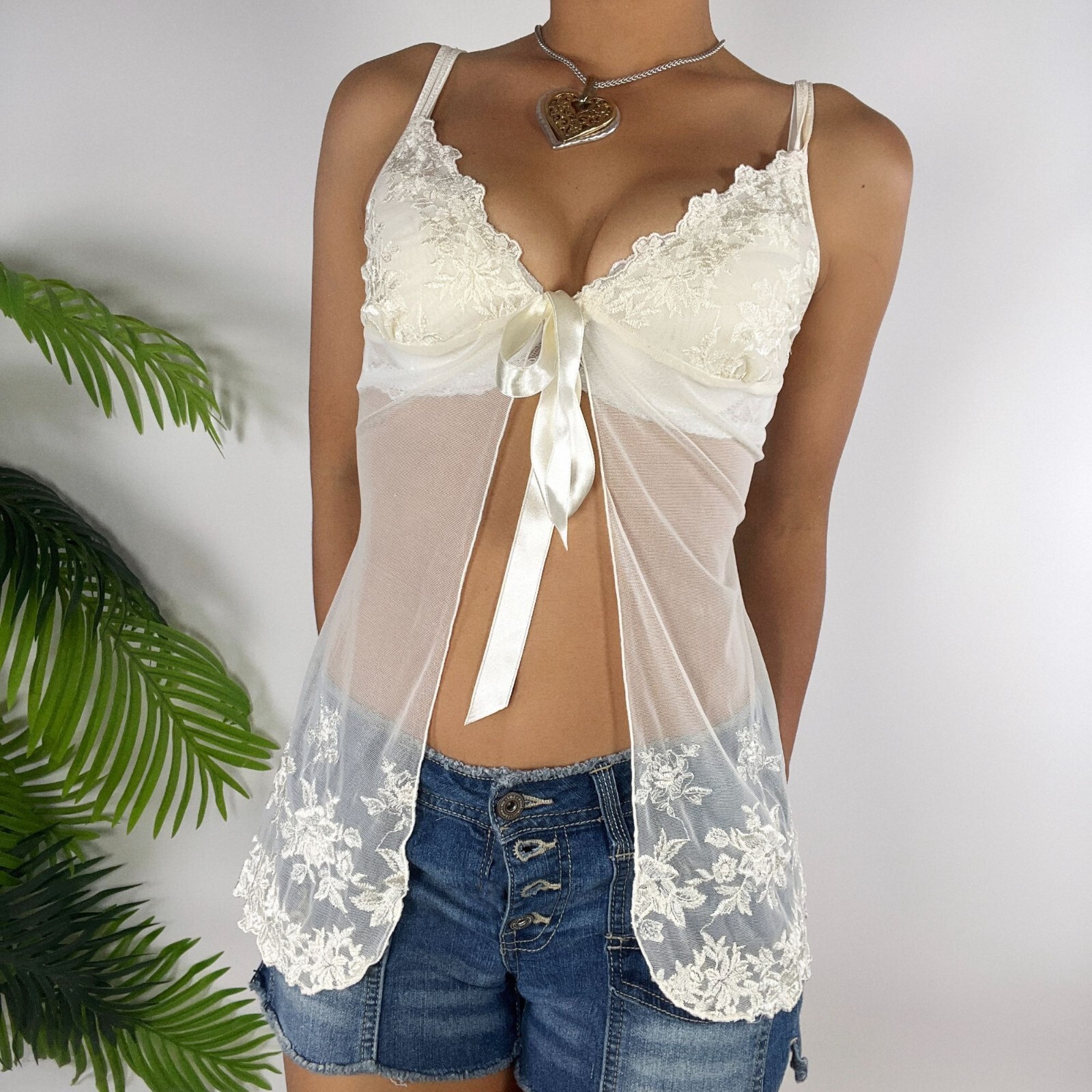 как выглядит Vintage 00s Cream Sheer Floral Lace Camisole Balletcore Coquette Tank Top / Medi фото