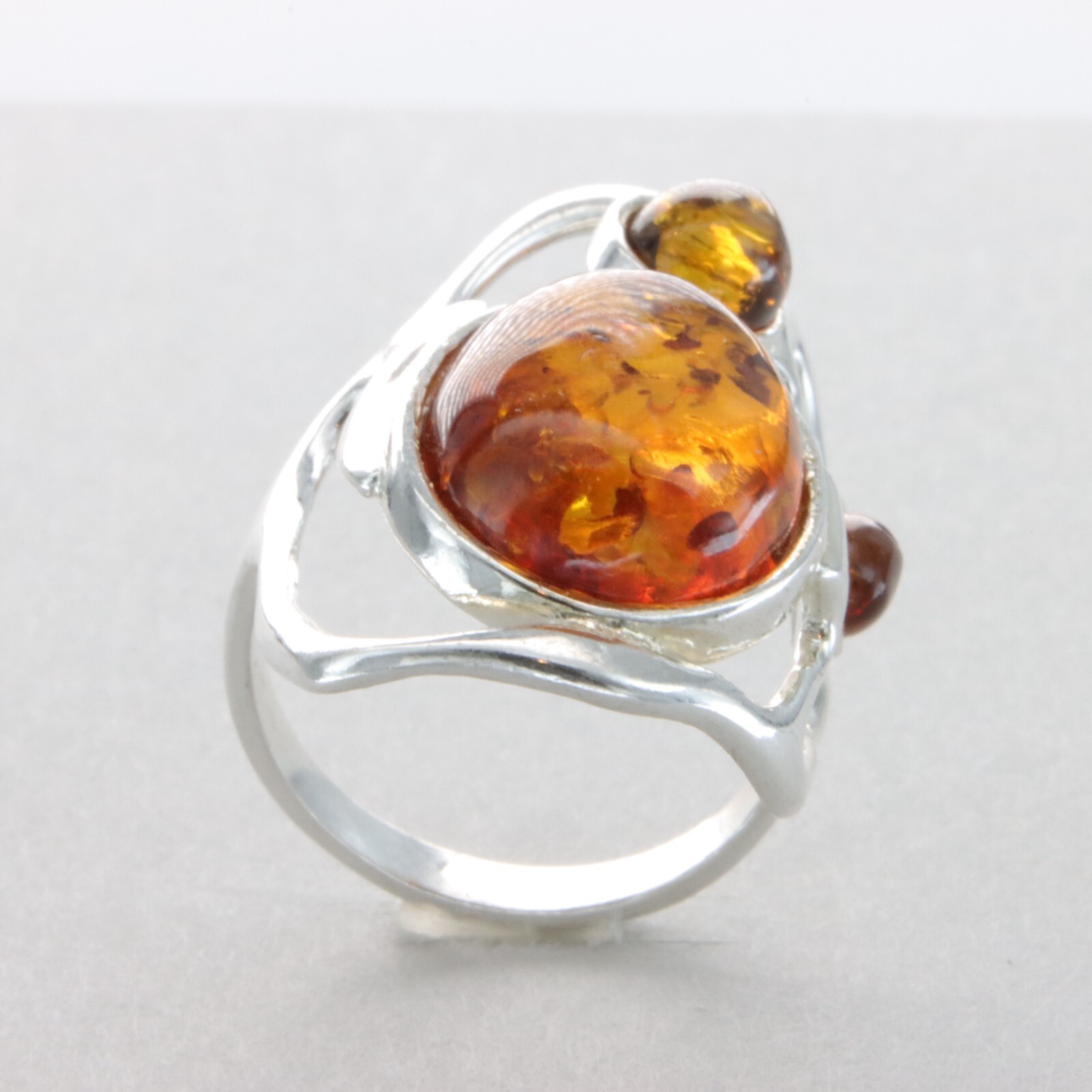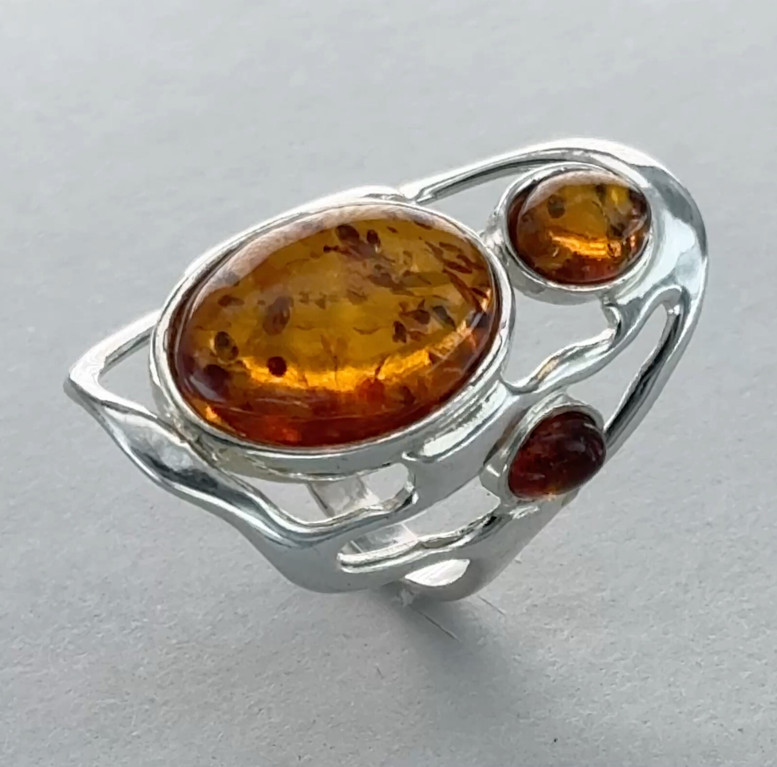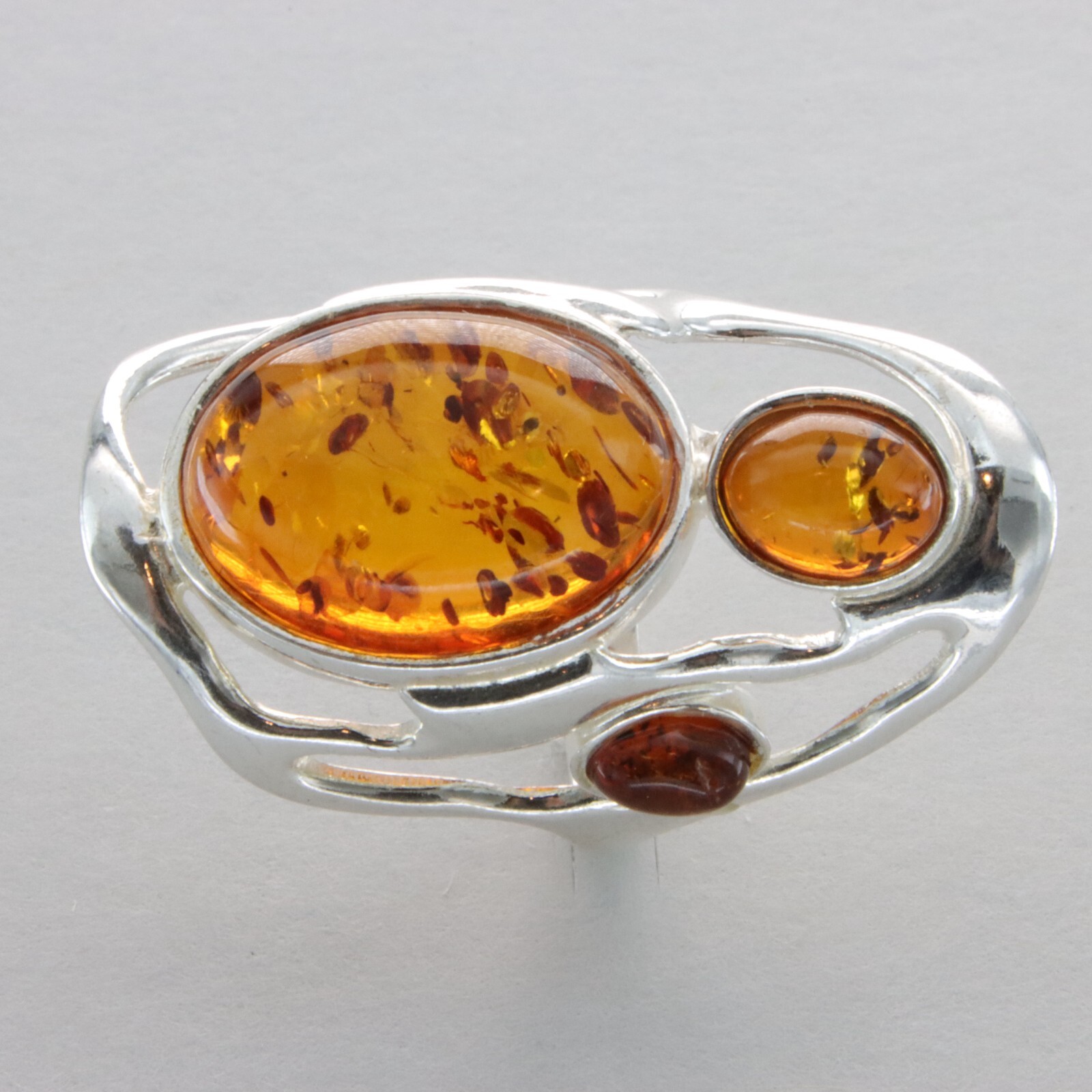 Triple Oval Cognac / Brown BALTIC AMBER Ring - 925 STERLING SILVER - Poland 96e