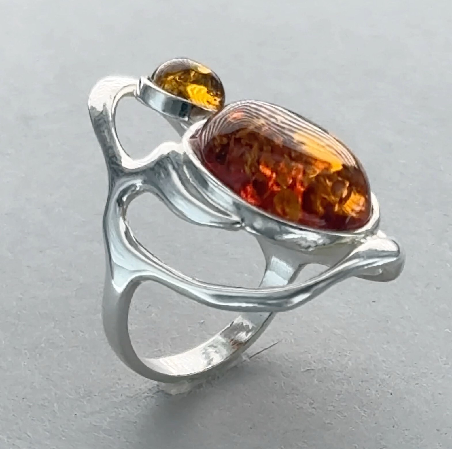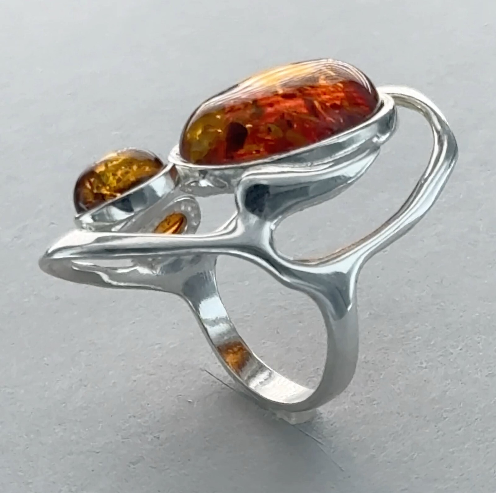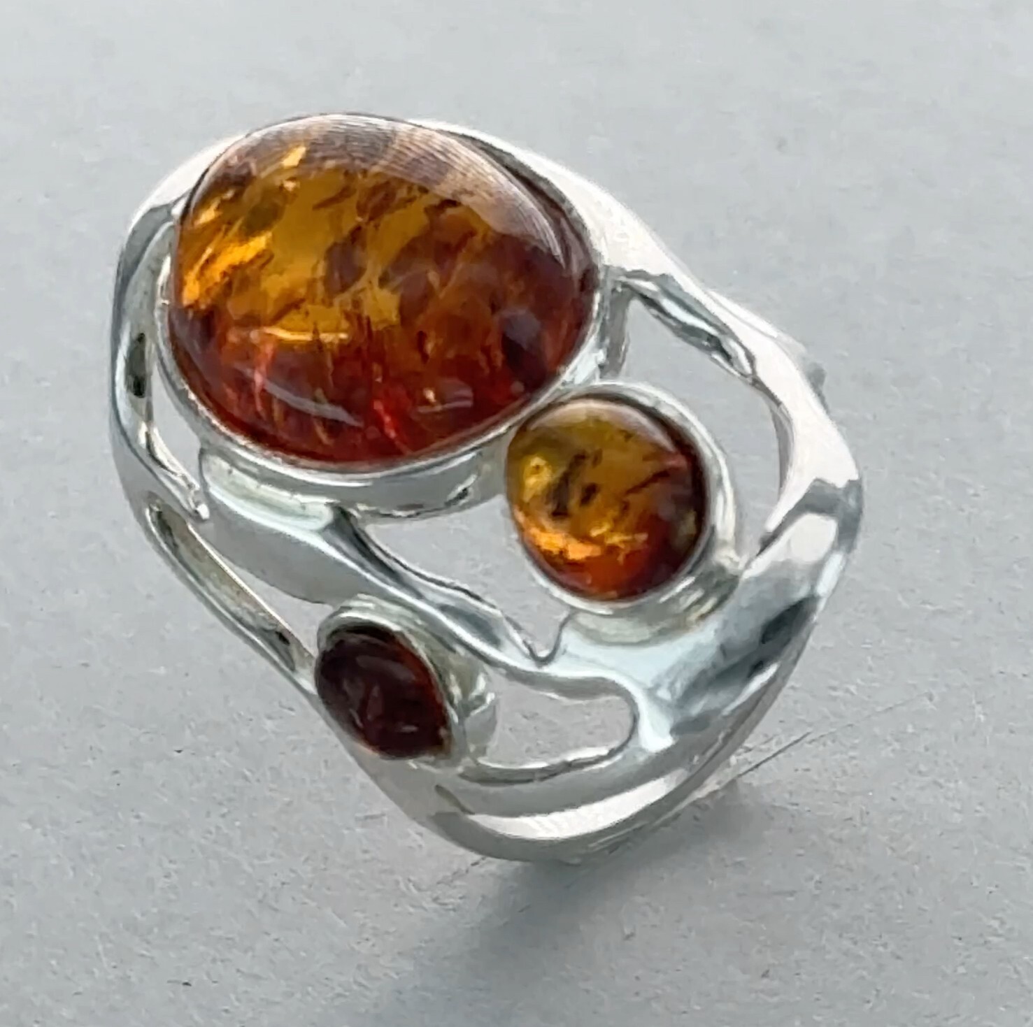 Triple Oval Cognac / Brown BALTIC AMBER Ring - 925 STERLING SILVER - Poland 96e