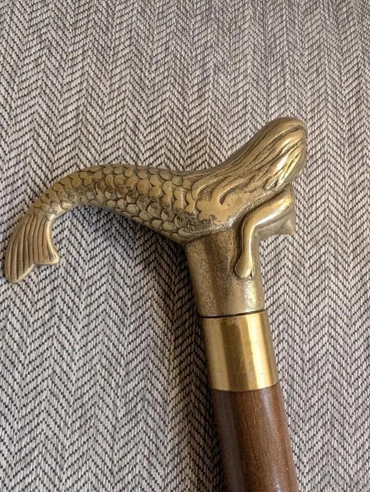 Vintage Brass Handle Mermaid wooden walking stick cane with a hidden flask