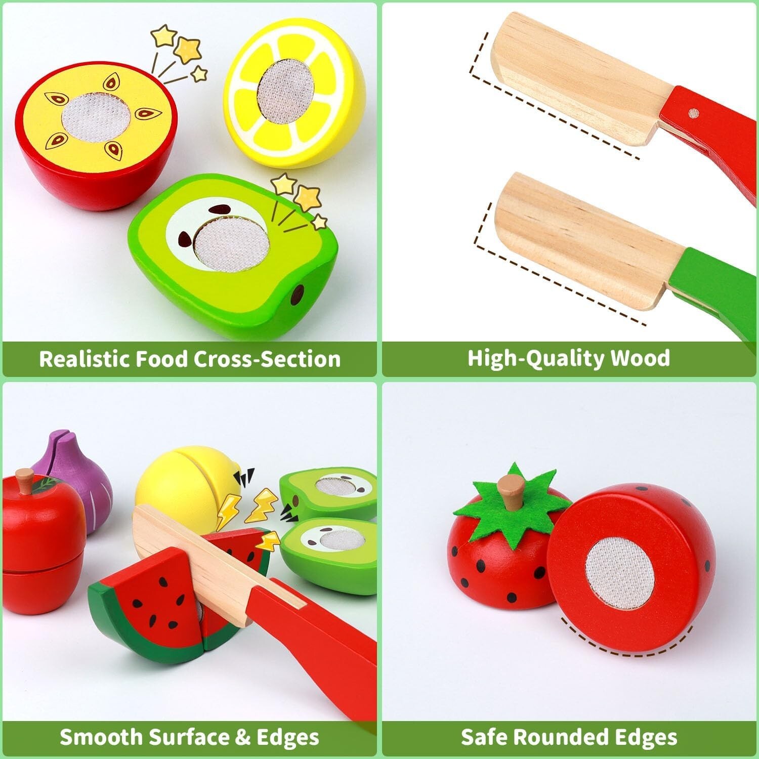 Wooden Play Food Toy Set for Kids Kitchen - 30 Pcs Montessori Cutting Color...