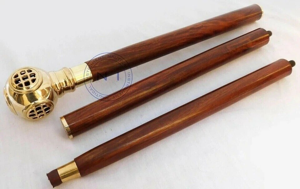 Shiny Brass Finished Diving Head Handle 3 Fold Wooden Walking Stick Victorian