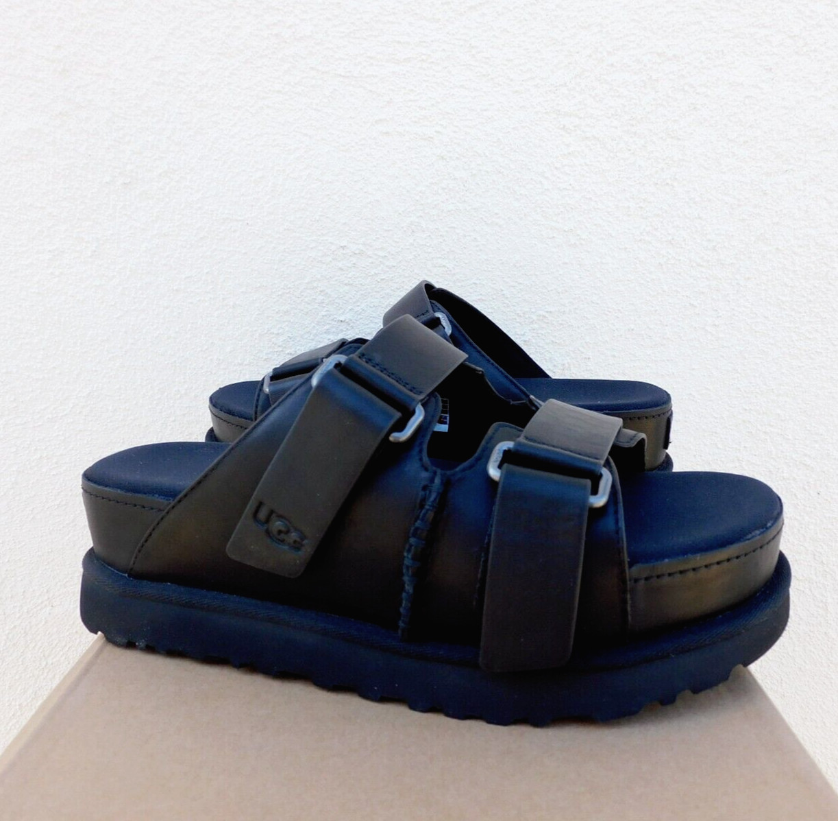 UGG BLACK LEATHER GOLDENSTAR HI PLATFORM SLIDE SANDALS, WOMEN US 7/ EUR 38 NIB