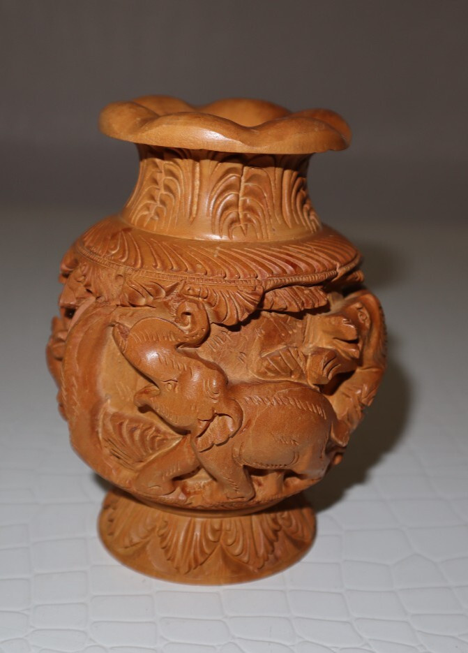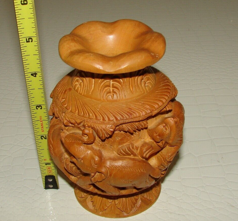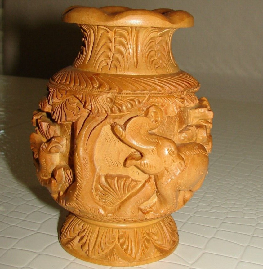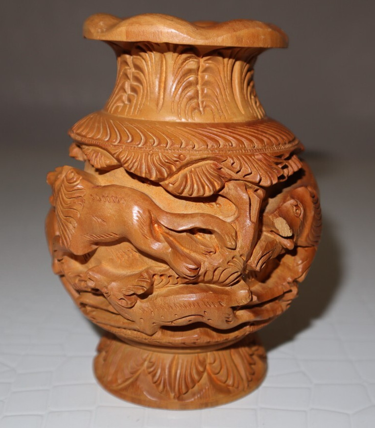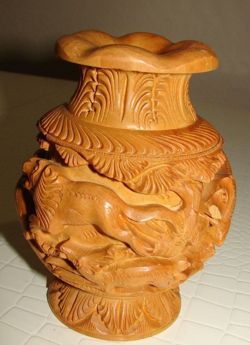 • Vintage Carved Wood Vase Elephant, Tiger, Deer, Lion Attack