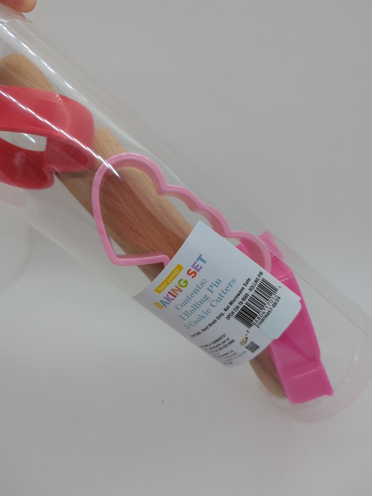 Kids Baking set 1 Rolling pin, 3 Cookie cutters Hearts Bake Cookies