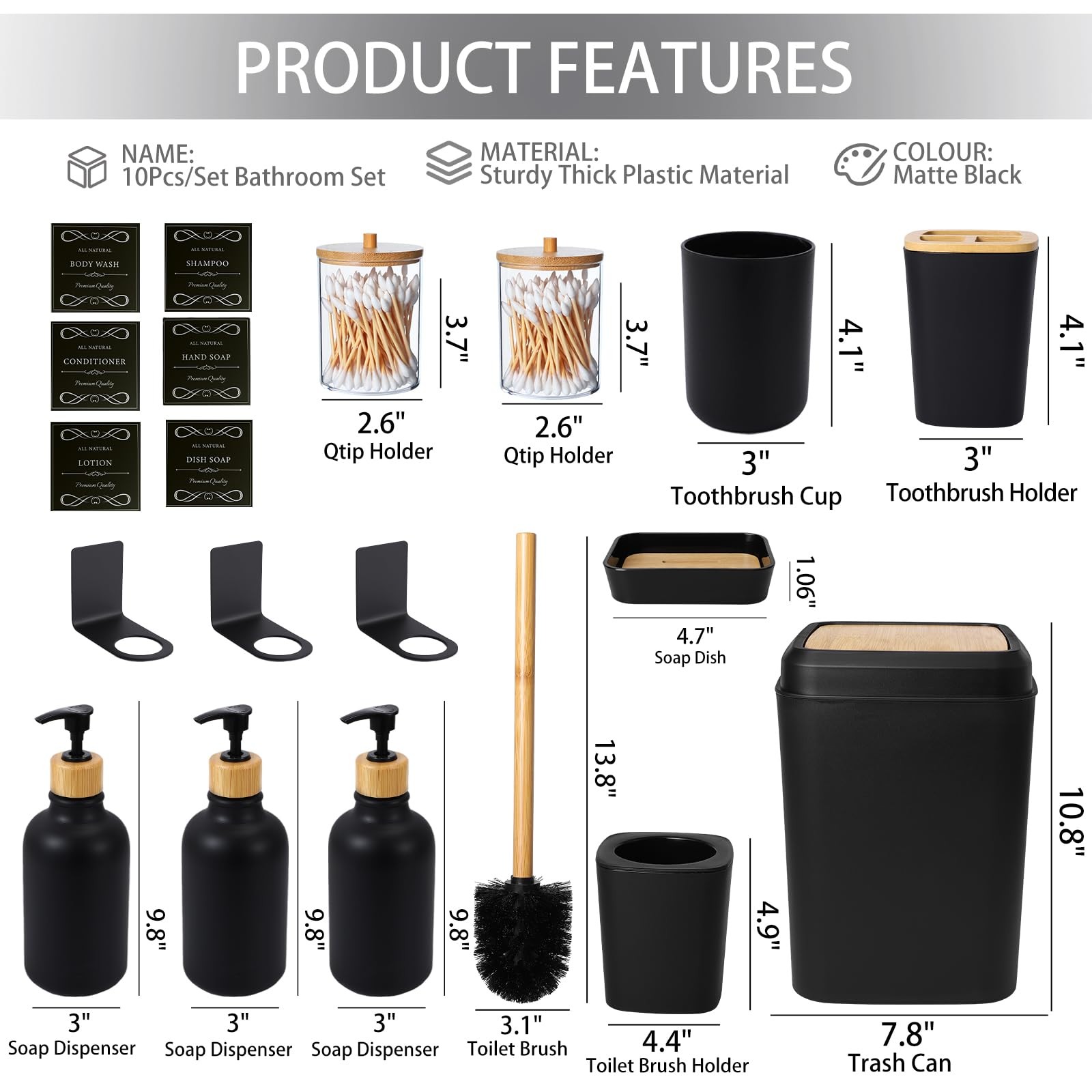 Black and Wood Bathroom Accessories Set 19Pcs, Bathroom Set with Trash Can and T