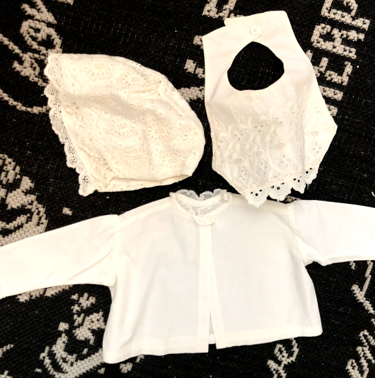 Vtg Antique White EMBROIDERED EYELET Button BABY BIB Doll Handmade Lined