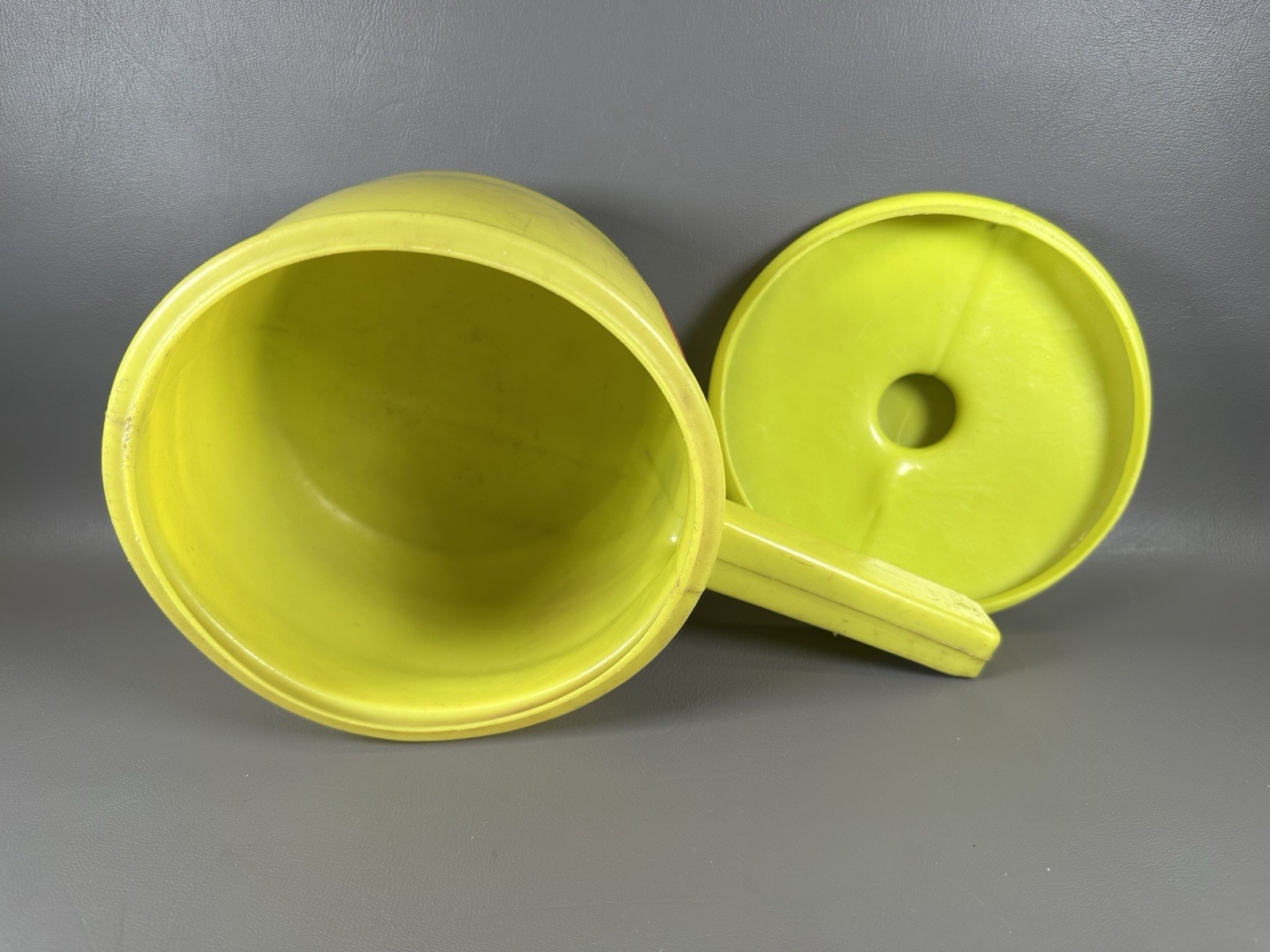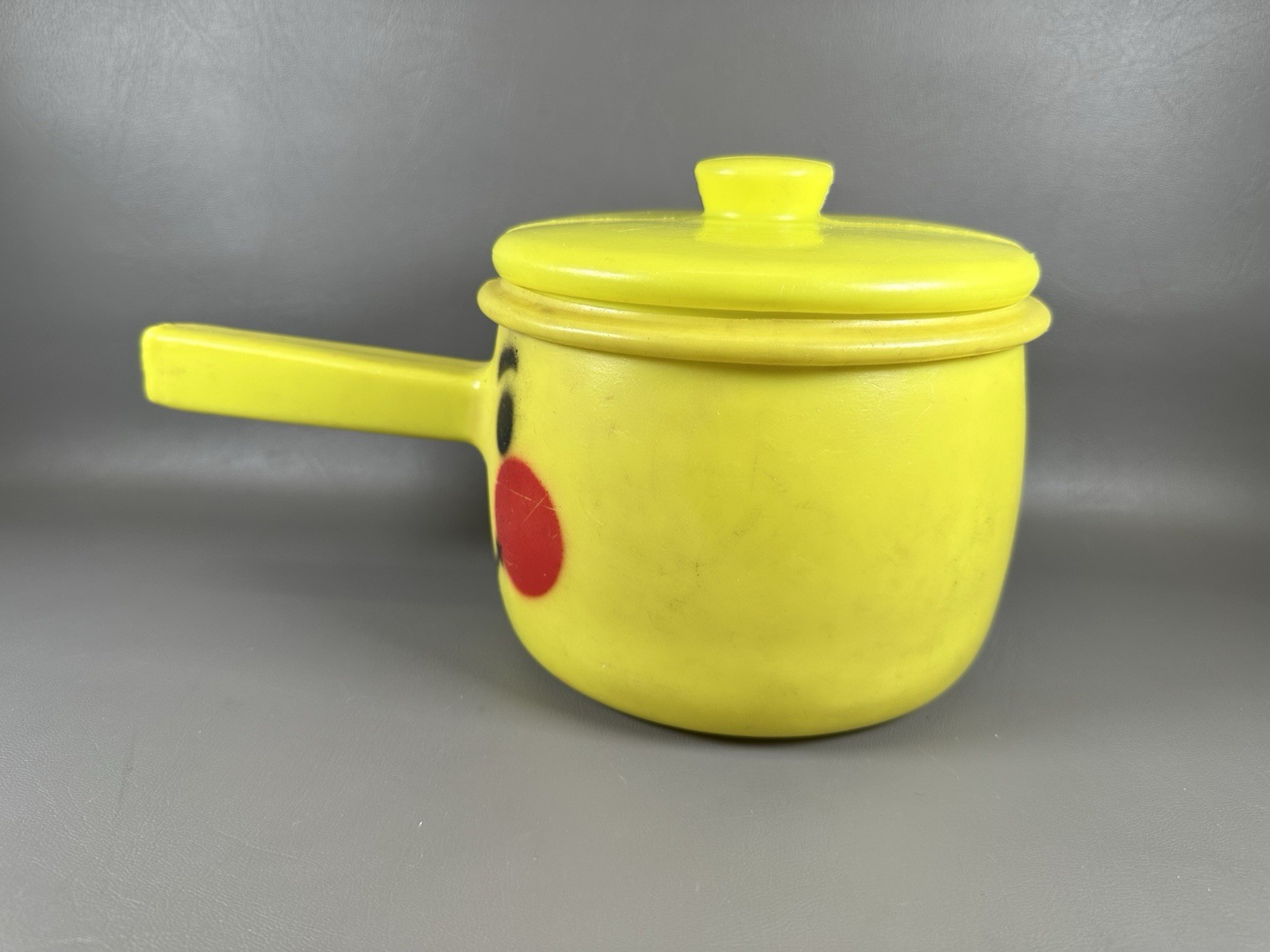 как выглядит Vintage Tanda Toys Handled Pot,Yellow with Smiley Face, Made in England фото