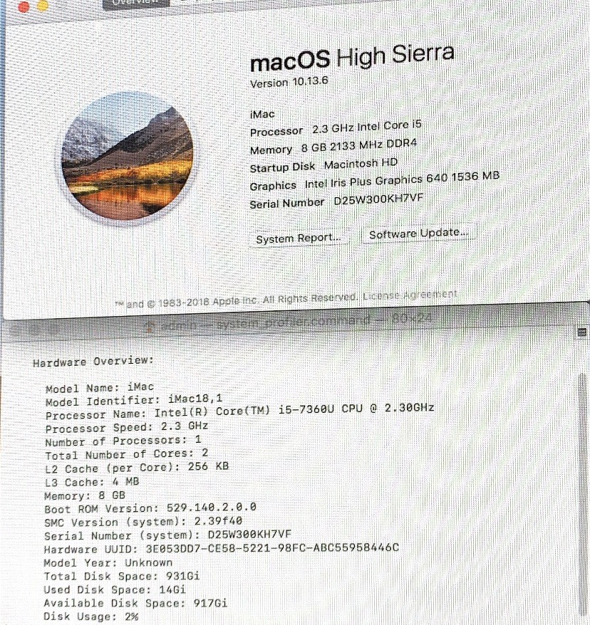 iMac 21 2017 2.3GHz i5-7360U 8GB RAM 1TB SSHD MacOS High Sierra