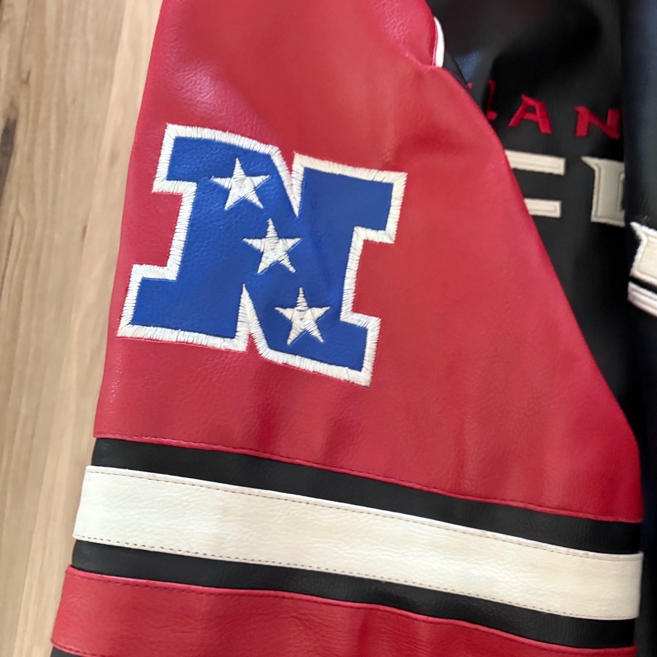 как выглядит NFL Bomber Jacket Medium Black Faux Leather Atlanta Falcons Midweight Sporty фото