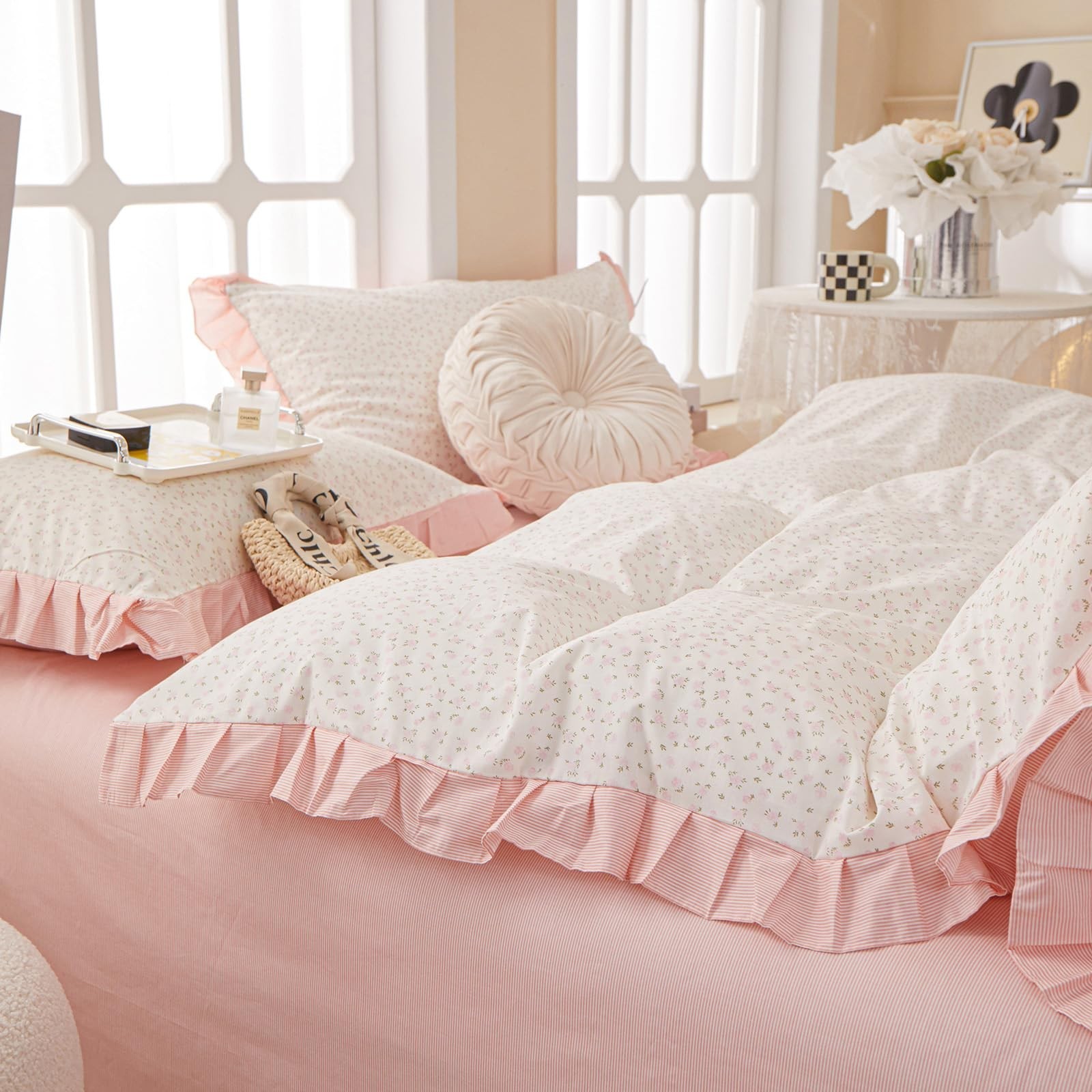 как выглядит Pink Floral Duvet Cover Full 100 Cotton Ruffle Duvet Cover Girls Princess La... фото