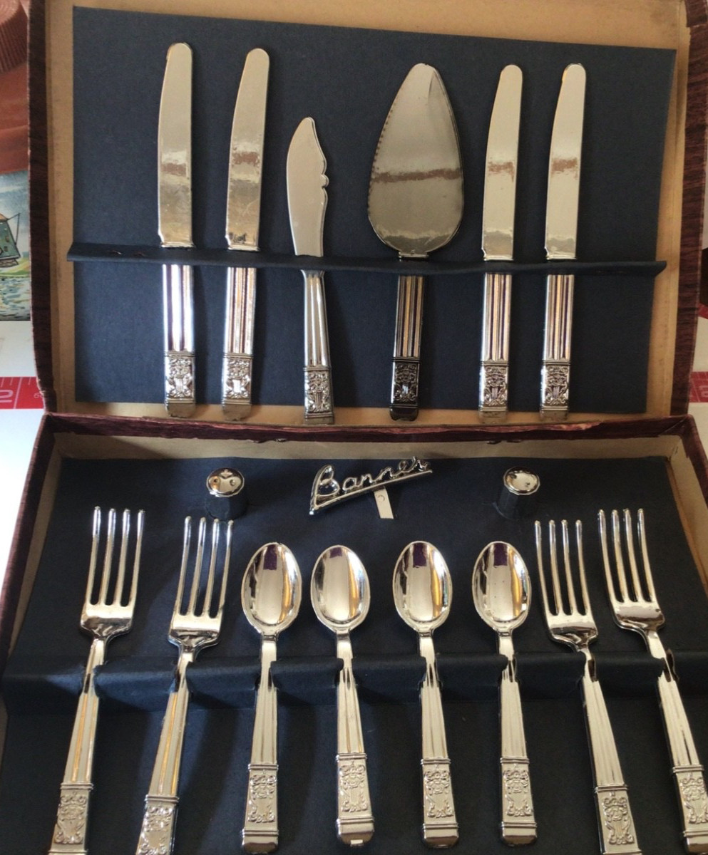 как выглядит Vintage 1950s BANNER METALTONE JUNIOR TABLEWARE - IOB - VGC фото