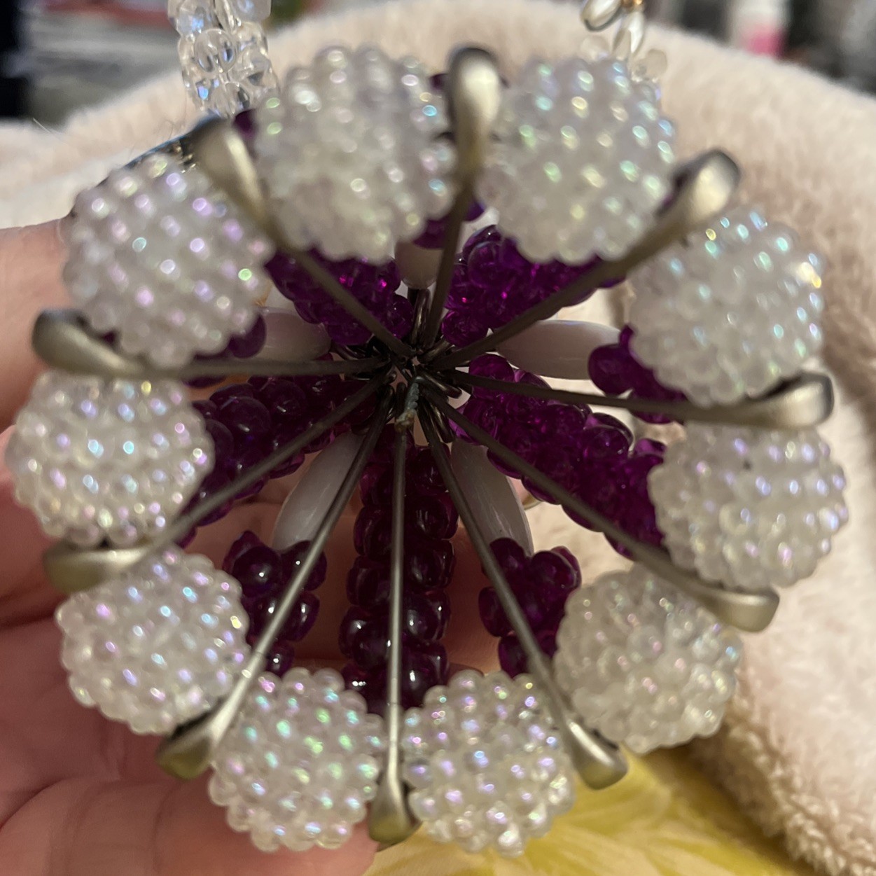 • Vintage Bead Safety Pin Doll Purple White Dress, Fancy Hat Handmade, Blonde