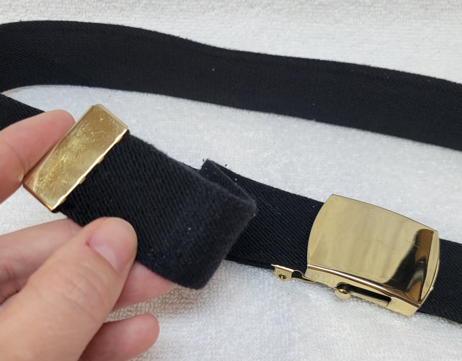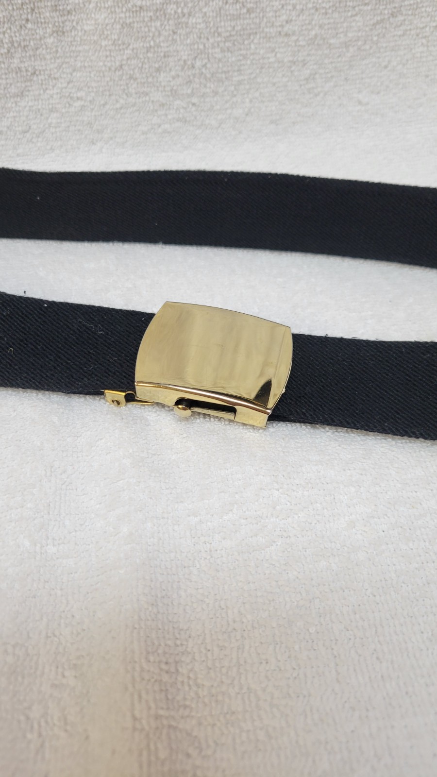 black adjustable web belt that stretches to any length; shiny brass buckle
