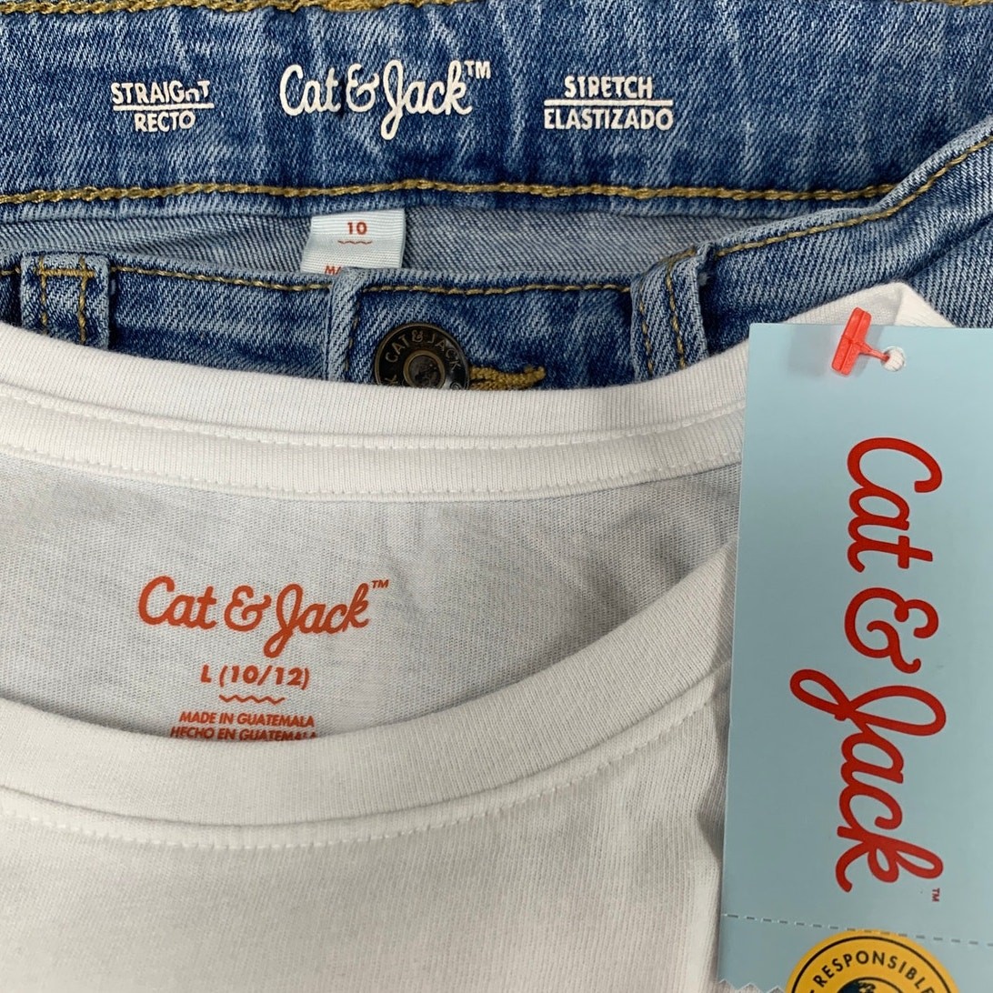 2 NWT New Cat Jack Boys Large 10/12 White Tee Shirt Straight Denim Jeans